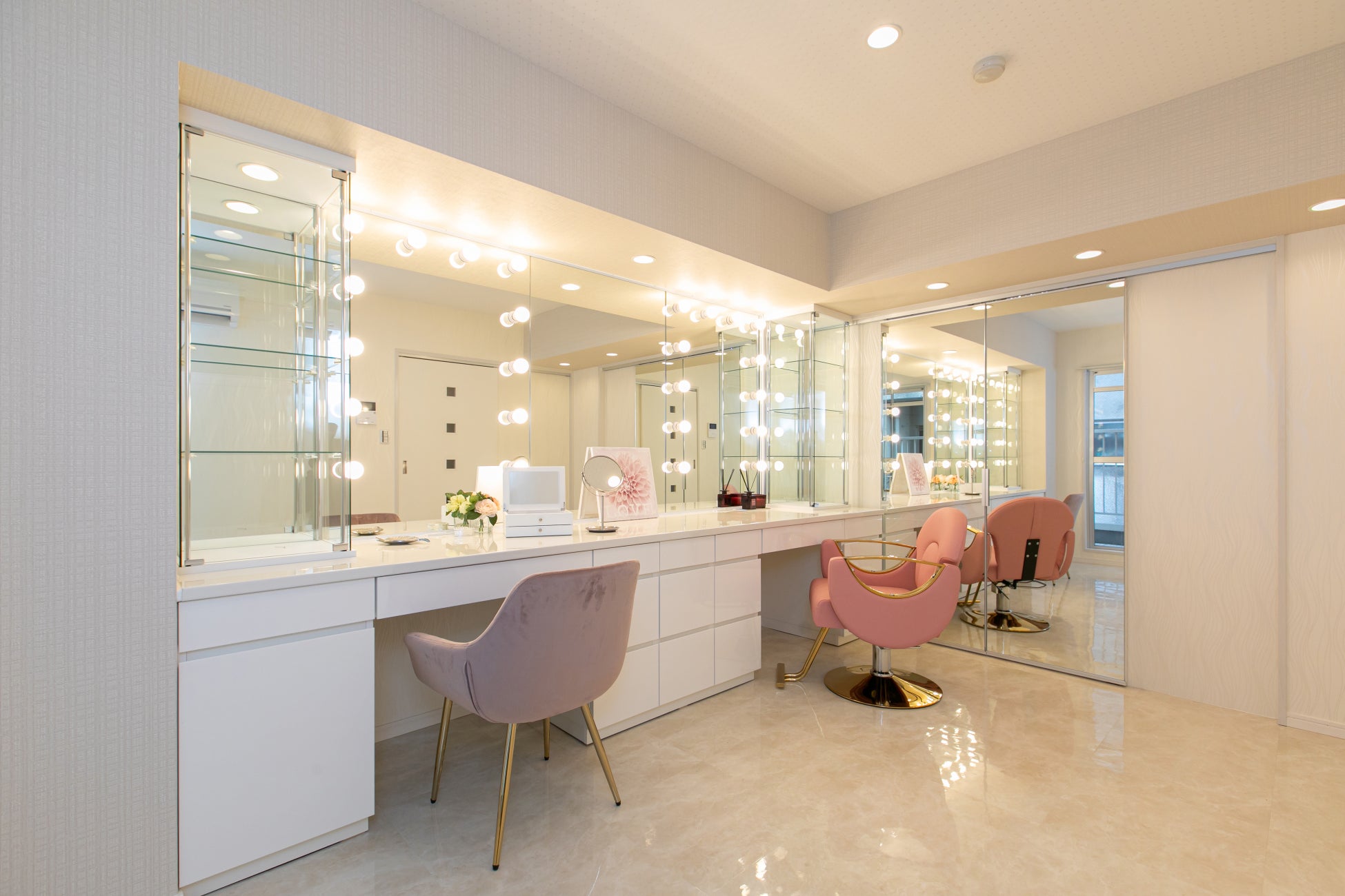 賃貸住宅ではウォークインクローゼットや全身が映る姿見を備えている物件は少なく、メイクも洗面や簡易的なドレッサーで行うことになります。そこでファッションやメイクが好きな人にとっての憧れの対象でもある女優が使うようなメイクROOMを作ることで、好きなものに囲まれた豊かな毎日を過ごしてほしいと考えました。