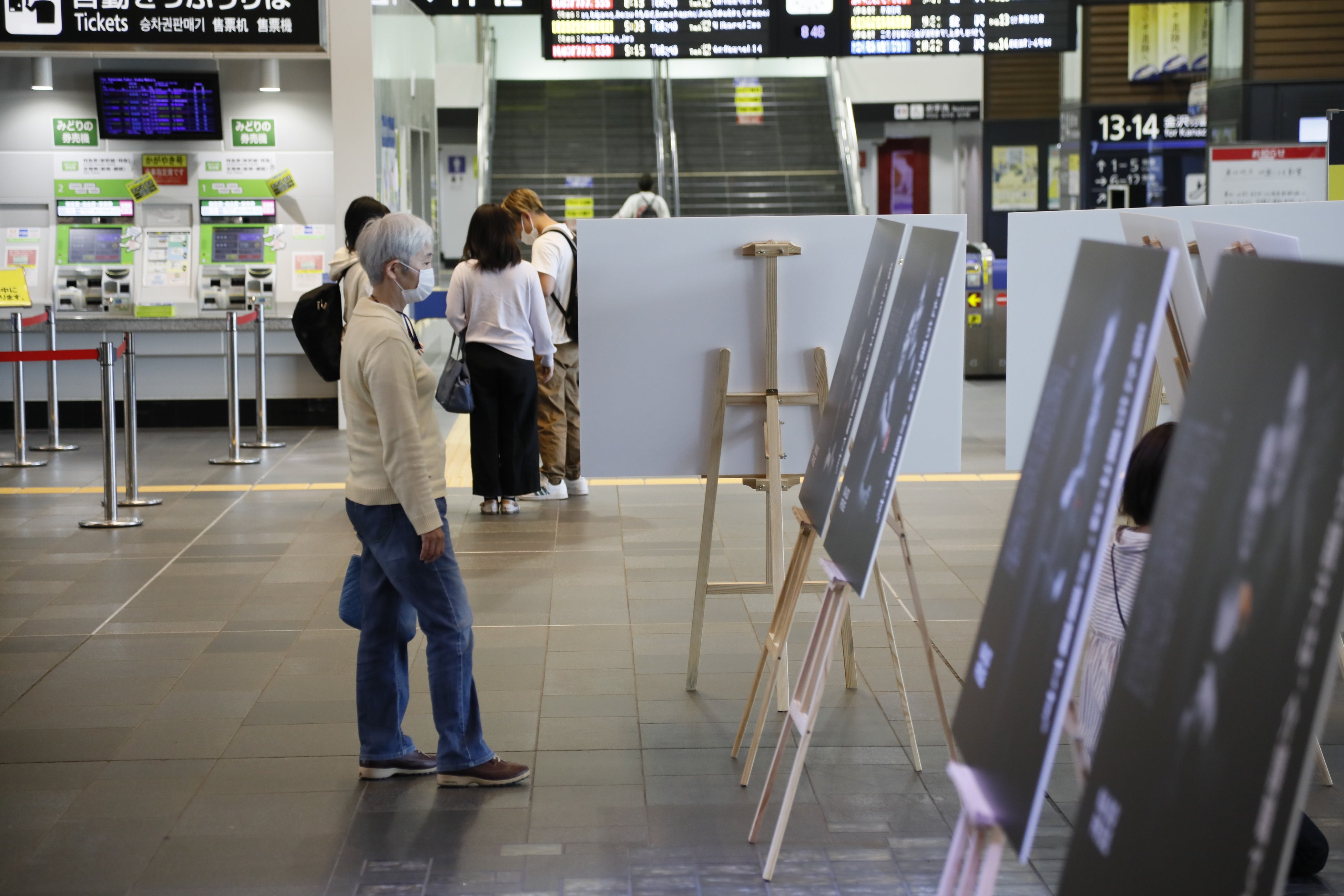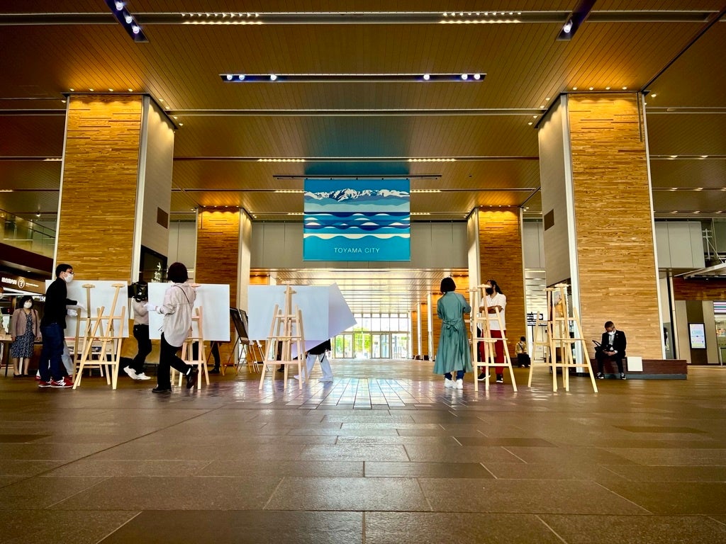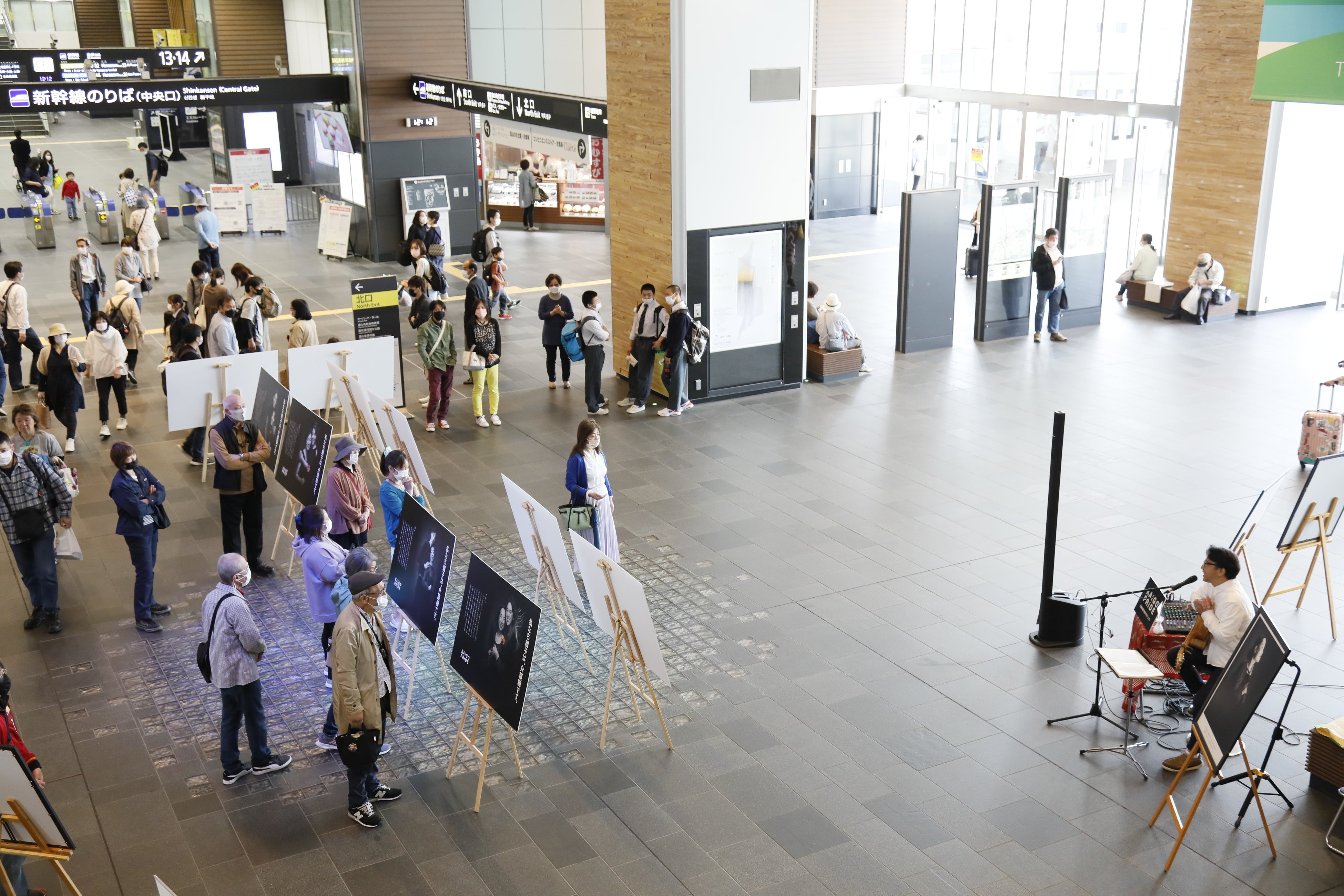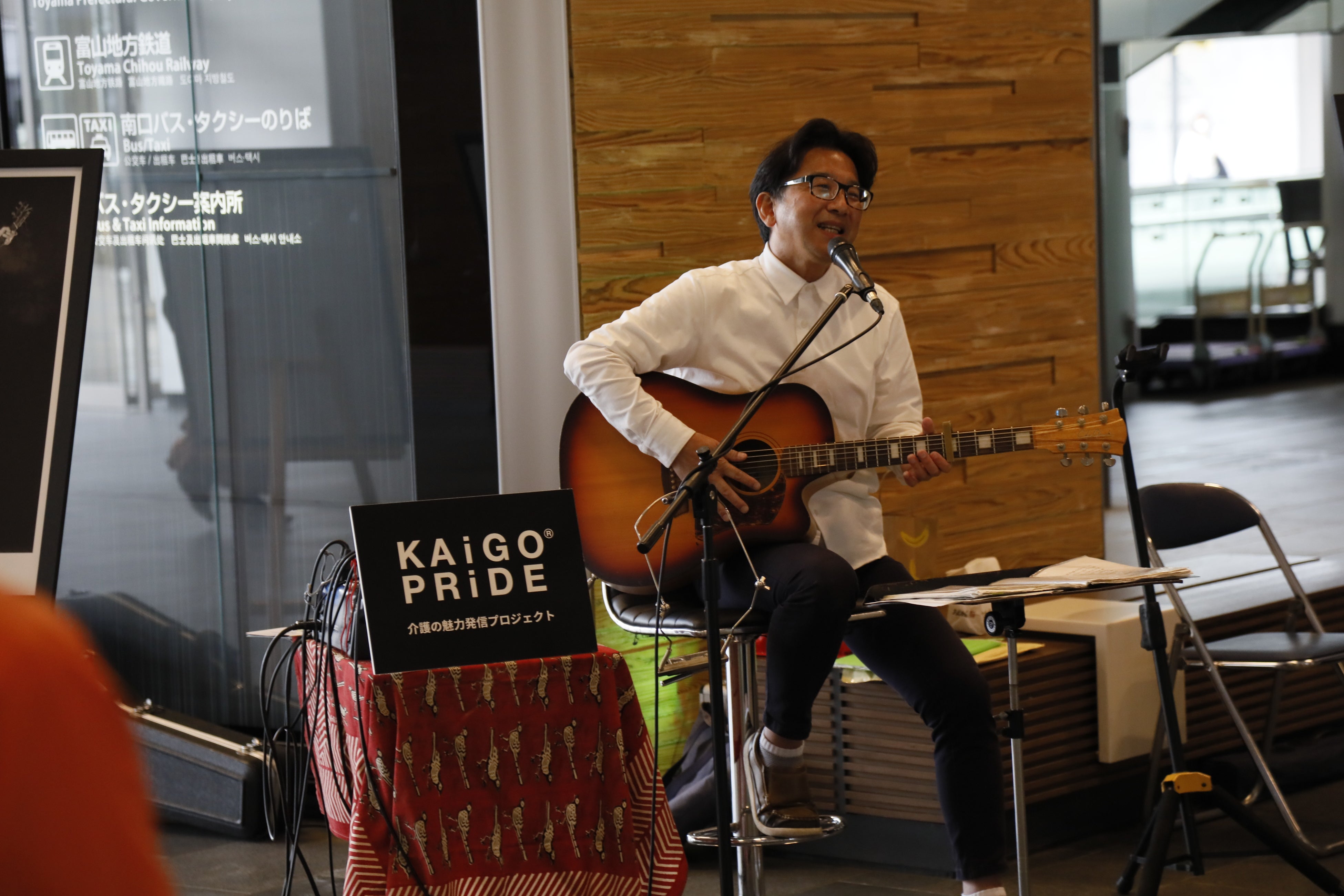 イベント最終日となる8日は、朝9時から富山駅自由通路・新幹線線改札前で写真展示を行いました。富山県内を中心に介護施設等で音楽活動などをされているシンガー英樹様による母の日や介護にちなんだミニライブを行うなど、駅を行き交う多くの方に新たな切り口での介護の魅力発信を行いました。立ち止まっての観覧者は述べ2051名(KAiGO PRiDE調べ)であり、この日はGW最終日ということもあって多くの方に足をとめて作品を見て頂きました。高齢者の方から親子連れまで、幅広い世代にご覧いただき、中には涙を流しながら見られている方もいらっしゃいました。