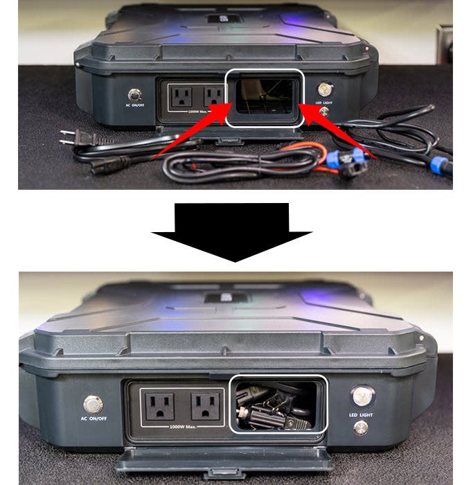 AC出力(×2):■100-120V/220-240V、 ■50/60Hz 1000W,サージ電圧 2000W