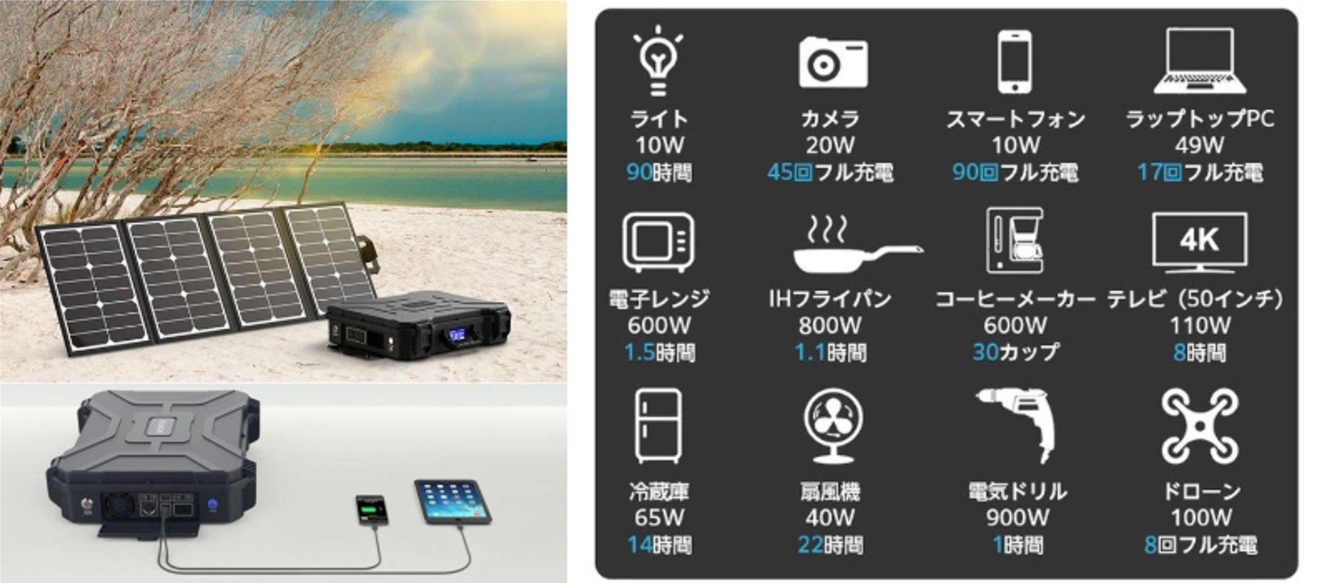 ミニ冷蔵庫は14時間、 扇風機なら22時間、 照明90時間。