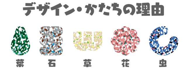 ひとつひとつ形も色も違う5つのMIKKEは、自然の中にある様々なモチーフを元にデザインしています。緑は葉っぱ、グレーは石、黄色は草、ピンクは花、青は虫。遊ぶ場所を見渡して、一番上手にカモフラージュ出来そうなMIKKEや、自分の好きなMIKKEを自由に選ぶことができます。