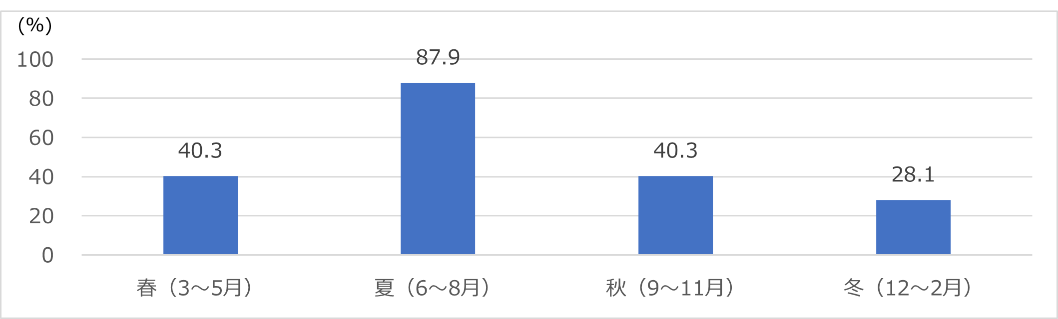 ❐ 脇汗の悩みは夏に大きく増加。冬でも4人に1人が、ほぼ毎日脇汗によって日常生活で困っていると回答。