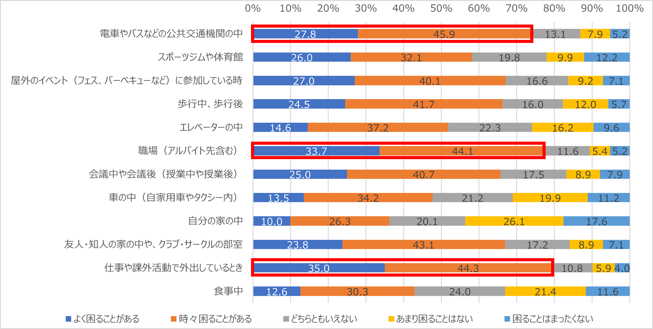 ■具体的に困ったシーンは「仕事や課外活動で外出しているとき」で79.3%、「職場」77.8%、「電車やバスなどの公共交通機関の中」73.7%と仕事や学業に関わることが高い傾向に。