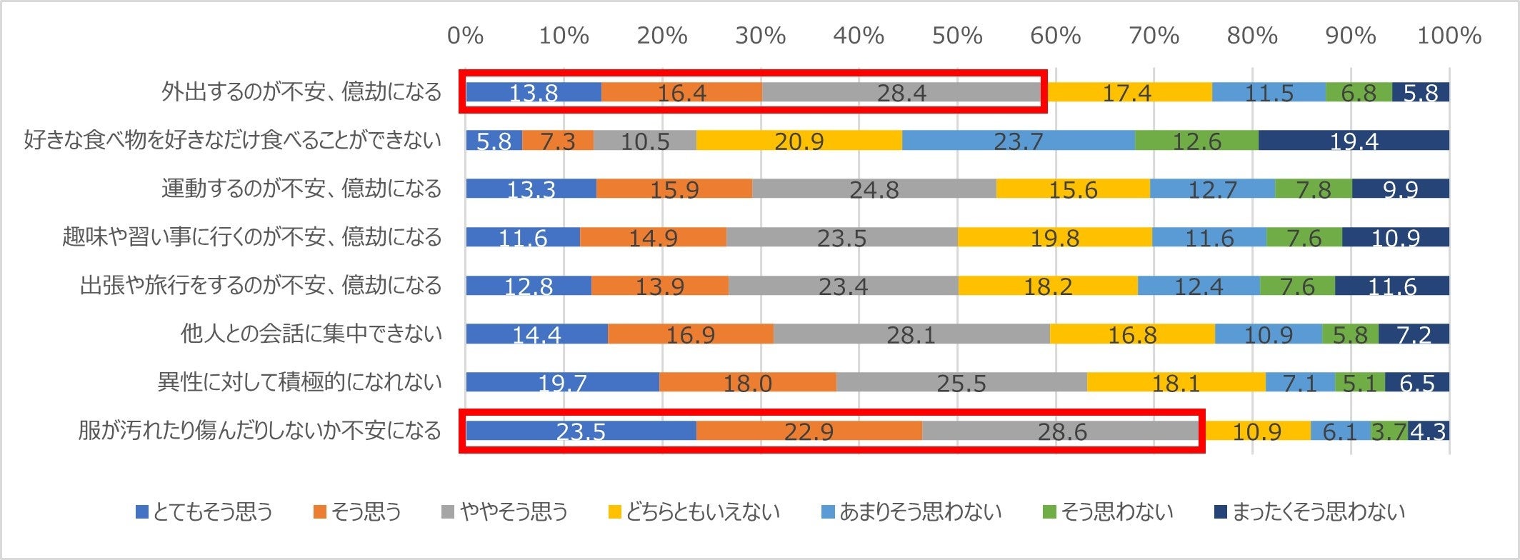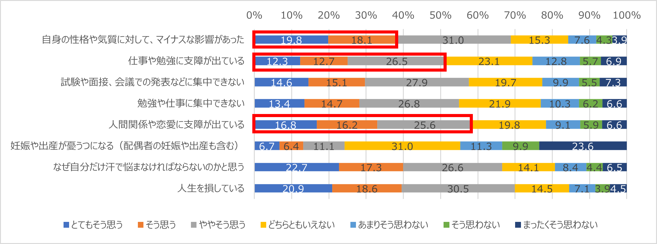 ■脇汗による不満は「服が汚れたり傷んだりしないか不安になる」がややそう思うまで含めると75.0%。また「自身の性格や気質に対して、マイナスな影響があった」68.9%、「外出するのが不安、億劫になる」58.5%、「人間関係や恋愛に支障が出ている」58.6%、「仕事や勉強に支障が出ている」51.5%と脇汗に悩む人のQOLに影響を及ぼしているだけでなく、脇汗によって積極的な振る舞いが難しくなっていることが分かる。