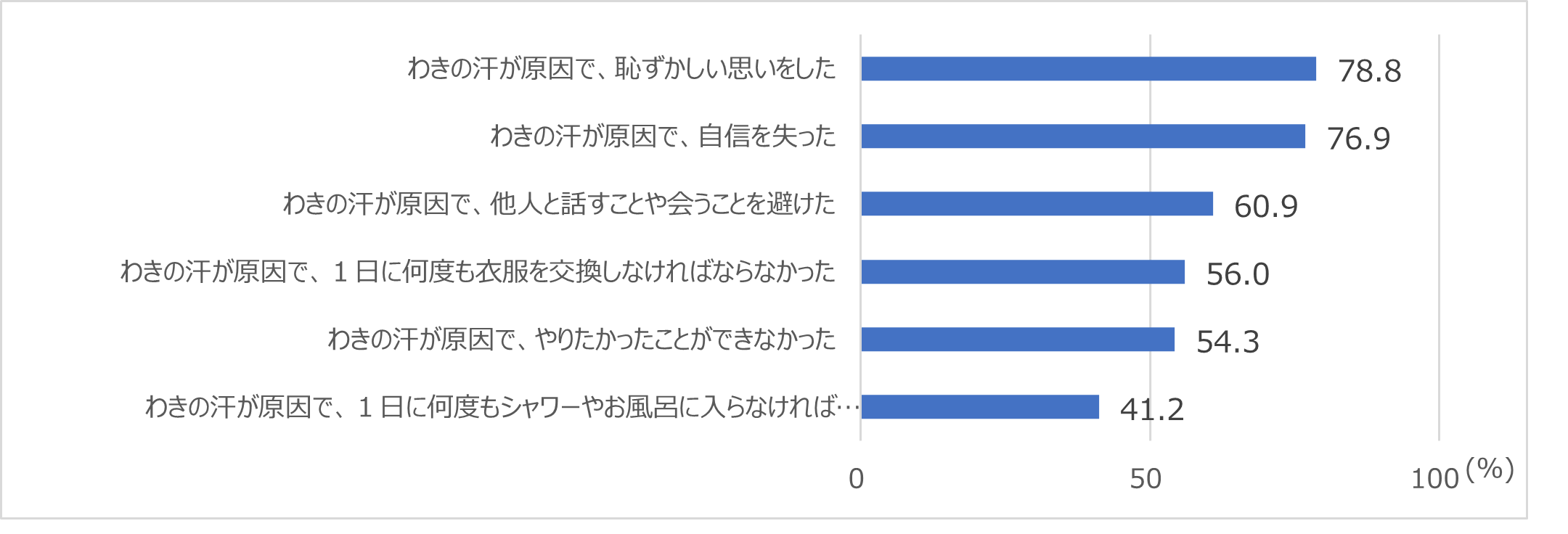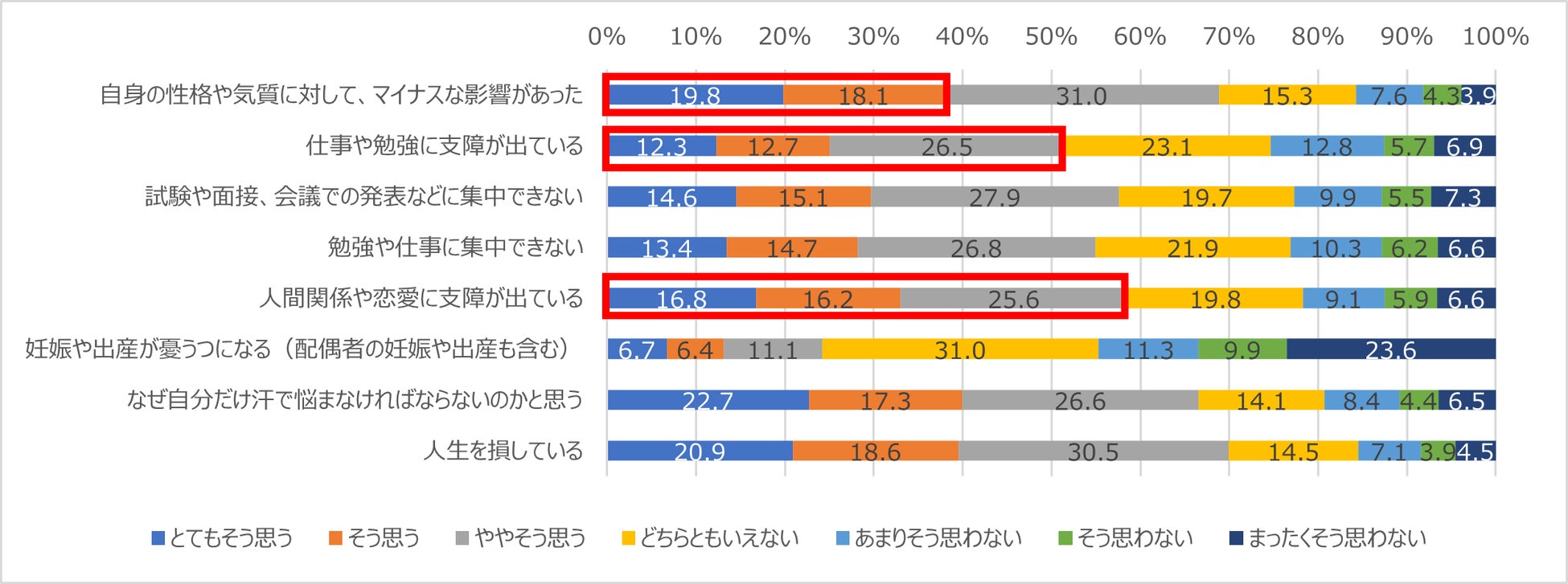 <脇汗の悩みに関する意識実態調査>脇汗に悩む人の多くが、汗によって積極的な振る舞いができない!?QOLの大きな低下だけでなく、対人関係や仕事・勉強のパフォーマンスにも影響