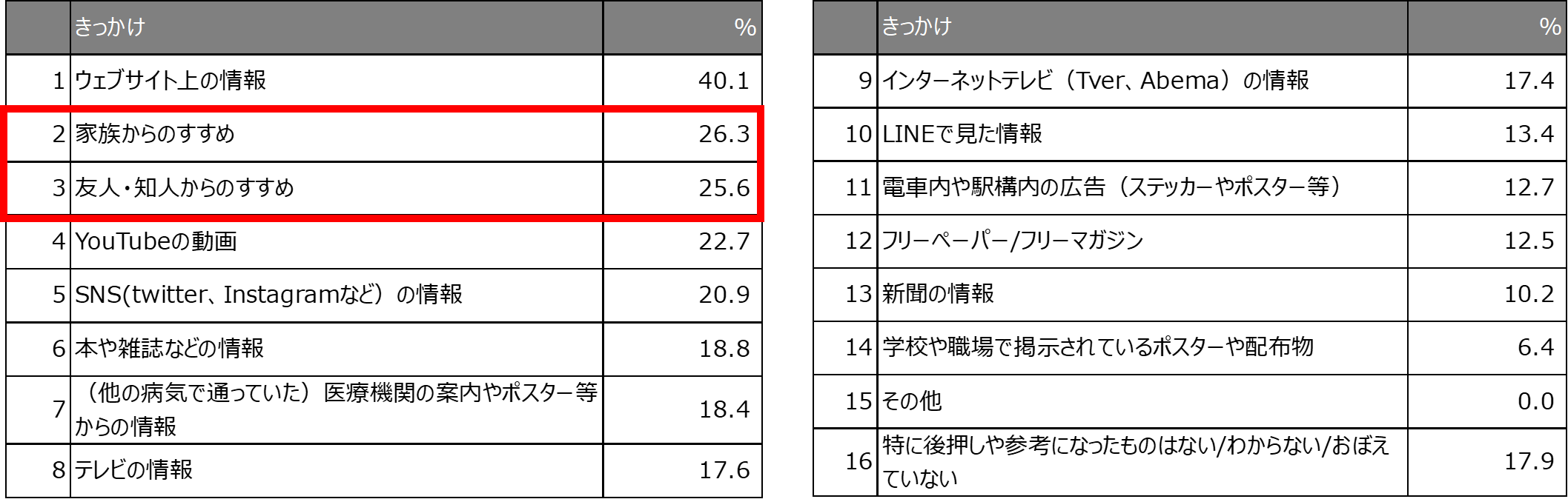 一方で受診したことのある人のきっかけは「ウェブサイト上の情報」以外にも「家族」「友人・知人」からのすすめも多い。