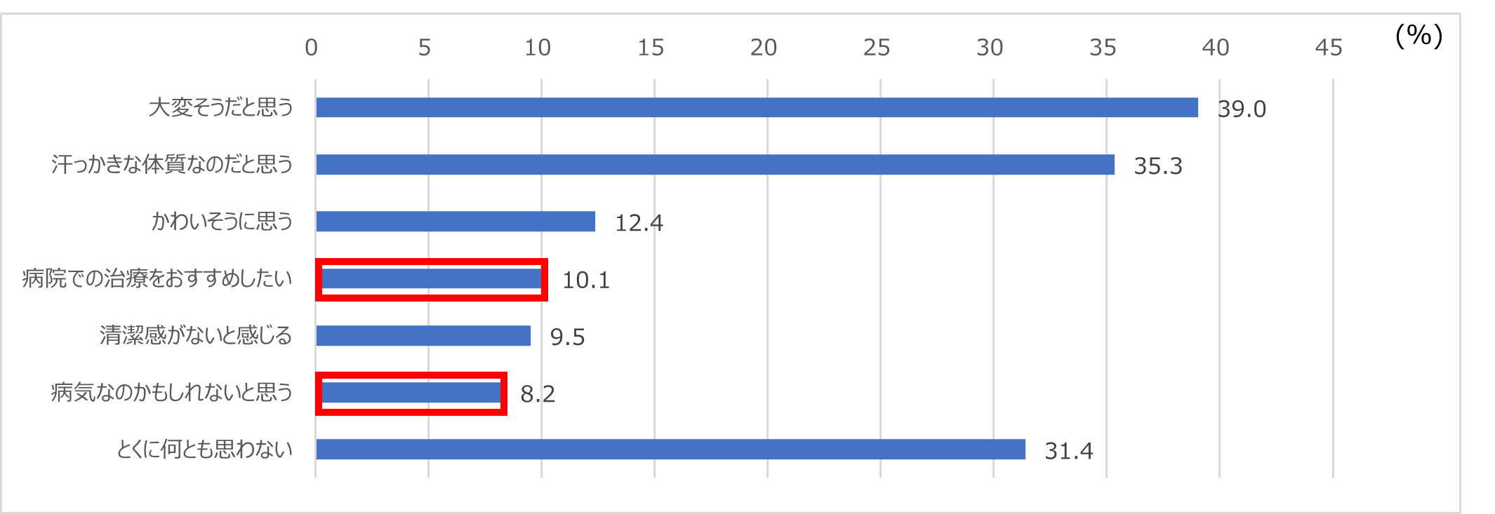 ■多汗症患者でない人が汗の多い人に対する印象は「大変そうだと思う」が4割に満たず39.0%。また「病院での治療をおすすめしたい」10.1%、「病気なのかもしれないと思う」8.2%と多汗症という病気の社会的理解が浸透されていないことがうかがえる。