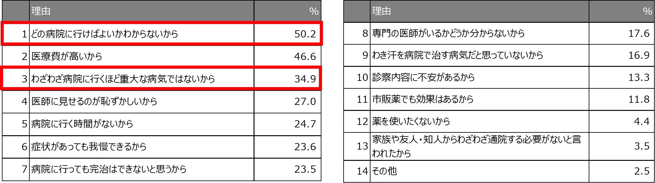 ■脇汗に悩む人が病院を受診しない理由は「どの病院に行けばよいかわからないから」が半数に。