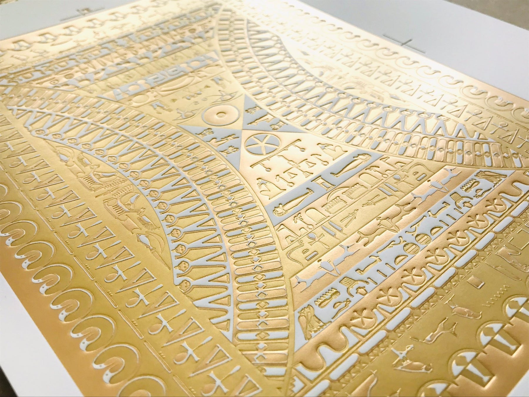 かつて「泥箔」と呼ばれた製造技法をベースに、当時の真鍮粉の配合などをし、現在主流となっているプラスチックフィルムベースではなく、紙ベースを採用することで、箔押し転写後のプラスチックごみの発生をなくし、紙表面のテクスチャーと真鍮粉の粒感を掛け合わせた独特の輝きを表現しました。また、この技法により、マットで高級感のあるメタリック表現も可能となりました。今後、装丁やパッケージなどへの環境に配慮した意匠表現として、提案してまいります。