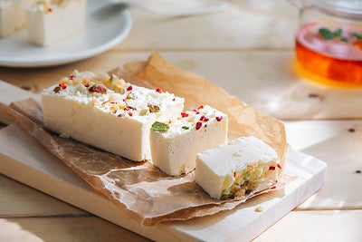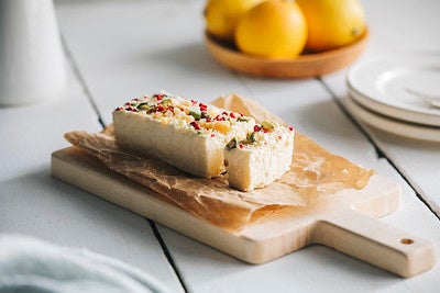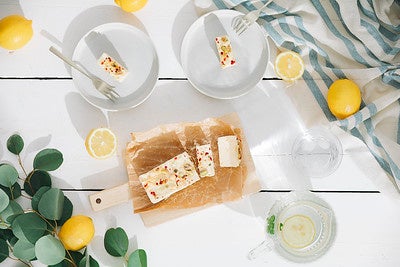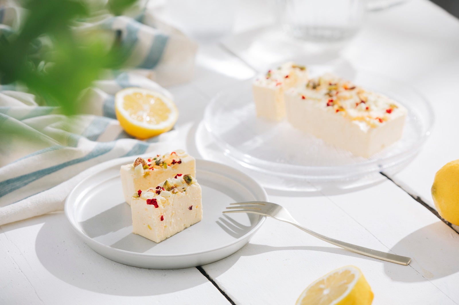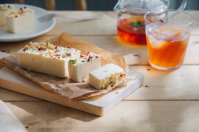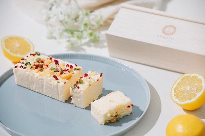 口どけのいいクリーミーな生地に広がる爽やかなレモンの酸味に、香ばしいナッツとドライフルーツがベストマッチ。溶かし具合や塩のアリ/ナシを変化させてみてお召し上がりくださいませ。