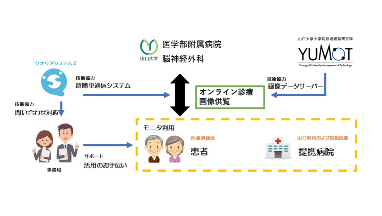 今後、山口県、山口大学、山口大学医学部附属病院脳神経外科及びクオリアシステムズは有機的に連携し、医療過疎地の高齢患者が簡単に医療相談を受けられる遠隔通信システムの構築に向けた開発と実証実験を行います。