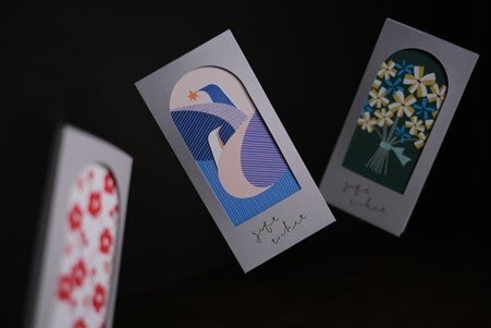 お祝いのタイミングで贈られる方はおめでたい梅のデザインや花束のデザイン。結婚する二人へは幸せの象徴として知られている鳩をモチーフに。金沢にゆかりのある方へ贈られる場合は、金沢の風景のデザイン。ストレートな言葉でメッセージを伝えられるデザイン。