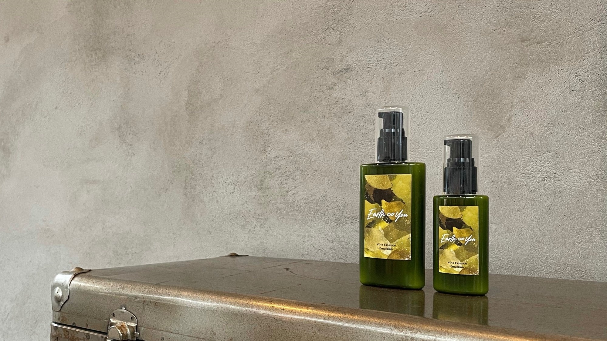 「 Earth∞You アースアンドユー 」は、長野県上田市のワイン用ぶどうの副産物を美容に活かしたエシカルコスメです。ぶどう栽培時には、旺盛に伸びた蔓や葉を取り除いたり、冬に枝の剪定を行います。普段は棄てるか燃やしているこれら副産物から「レスベラトロール」を高濃度※抽出、整肌成分(ブドウつるエキス)として配合しました。 ※ 当社通常抽出エキス比10倍濃度