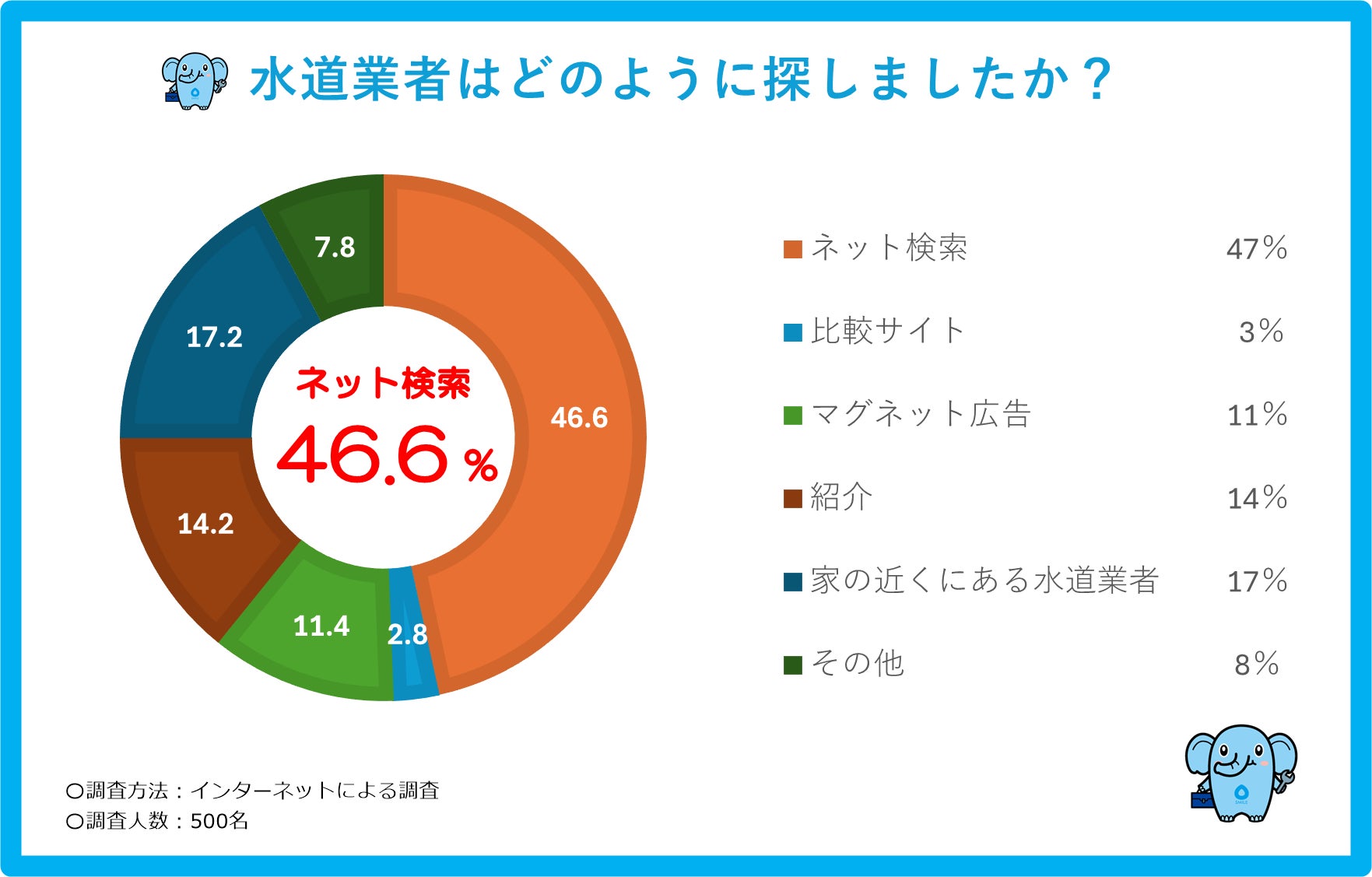 まず「水道業者をどのように探しましたか?」という質問した所、「ネット検索」で水道業者を探す方の割合が一番多く、約半数の46.6%となります。スマホが普及し、時代の移り変わりと共に水道業者の探し方も変わって来ていますね。