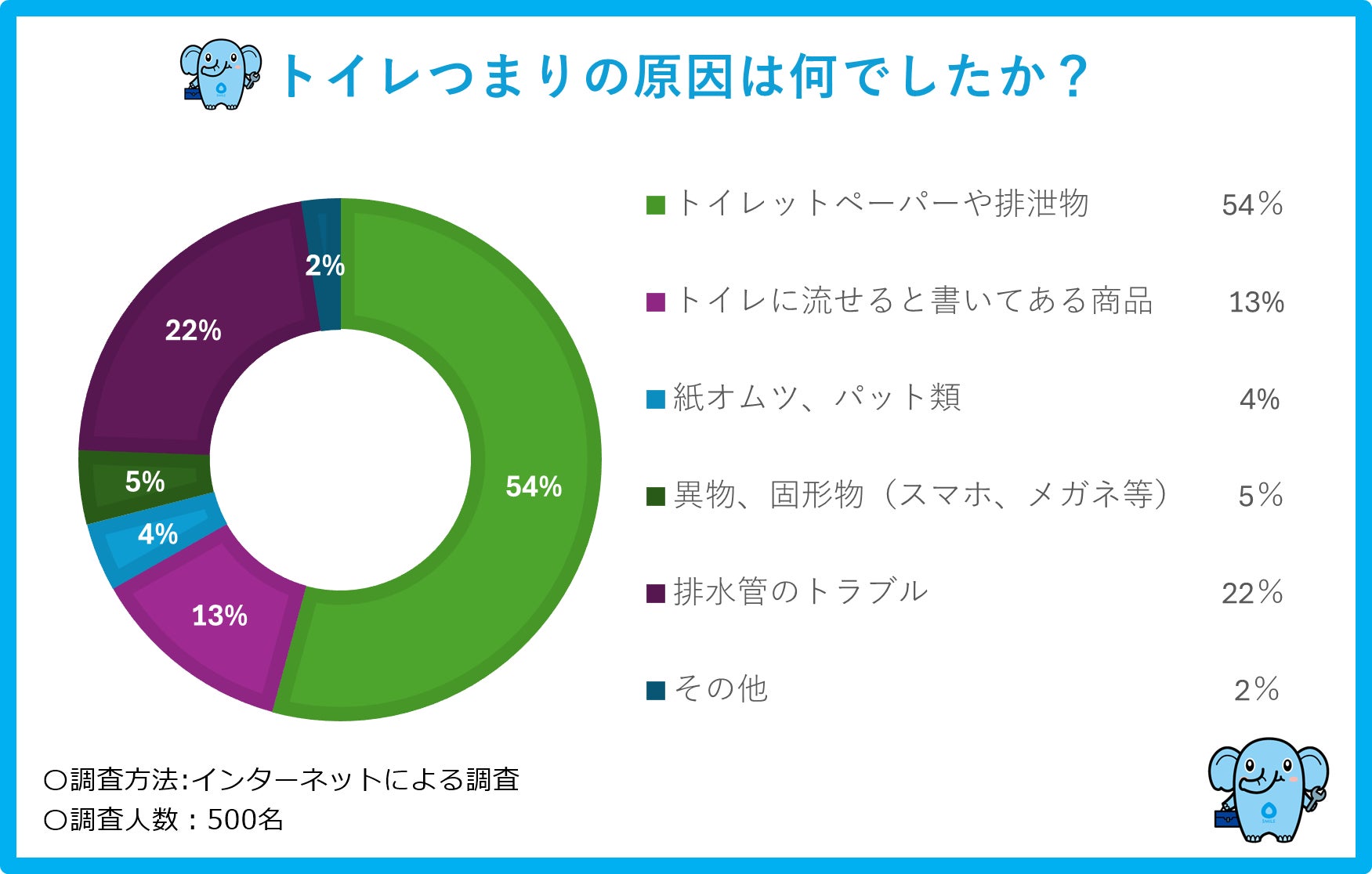 次に「トイレつまりの原因は何でしたか?」と質問した所、トイレ詰まりの半数以上はトイレットペーパーや排泄物による詰まりと言う事が分かりました。