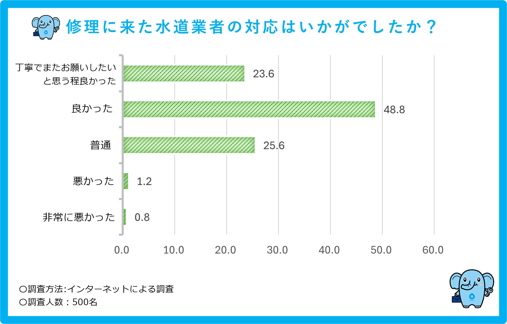 次に「修理に来た水道業者の対応はいかがでしたか?」という質問には、調査に協力してくれた500名の内、普通以上(丁寧でまたお願いしたいと思う程良かった、良かった、普通)の評価が490名で98.0%でした。