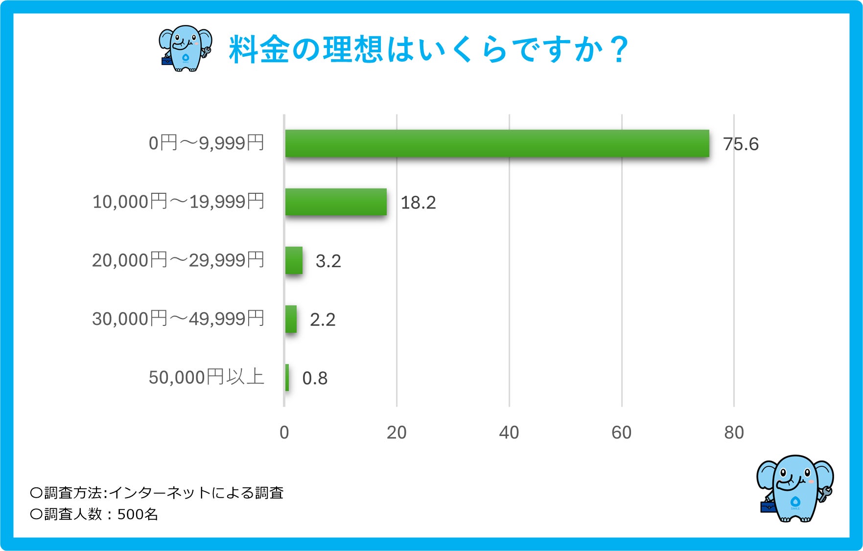 最後に「理想の料金はいくらですか?」と言う質問では、トイレつまりの修理料金の理想は9,999円以下が75.6%で断トツの1位でした。それは利用者として修理料金が安く済んだら良いと思うのは当然のことだと思います。