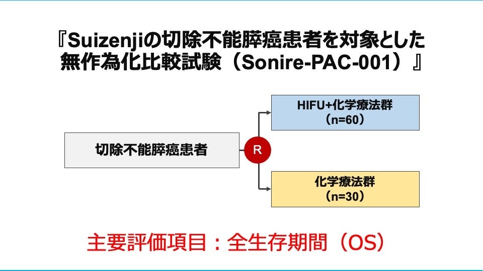 本治験では、一次化学療法に不応不耐の切除不能膵がん患者を対象として、二次化学療法とHIFUを併用した際の有効性を、二次化学療法を対照として全生存期間を主要評価項目として検討します(目標症例数:90例)。本試験の詳細は下記WEBサイトにて確認いただけます。