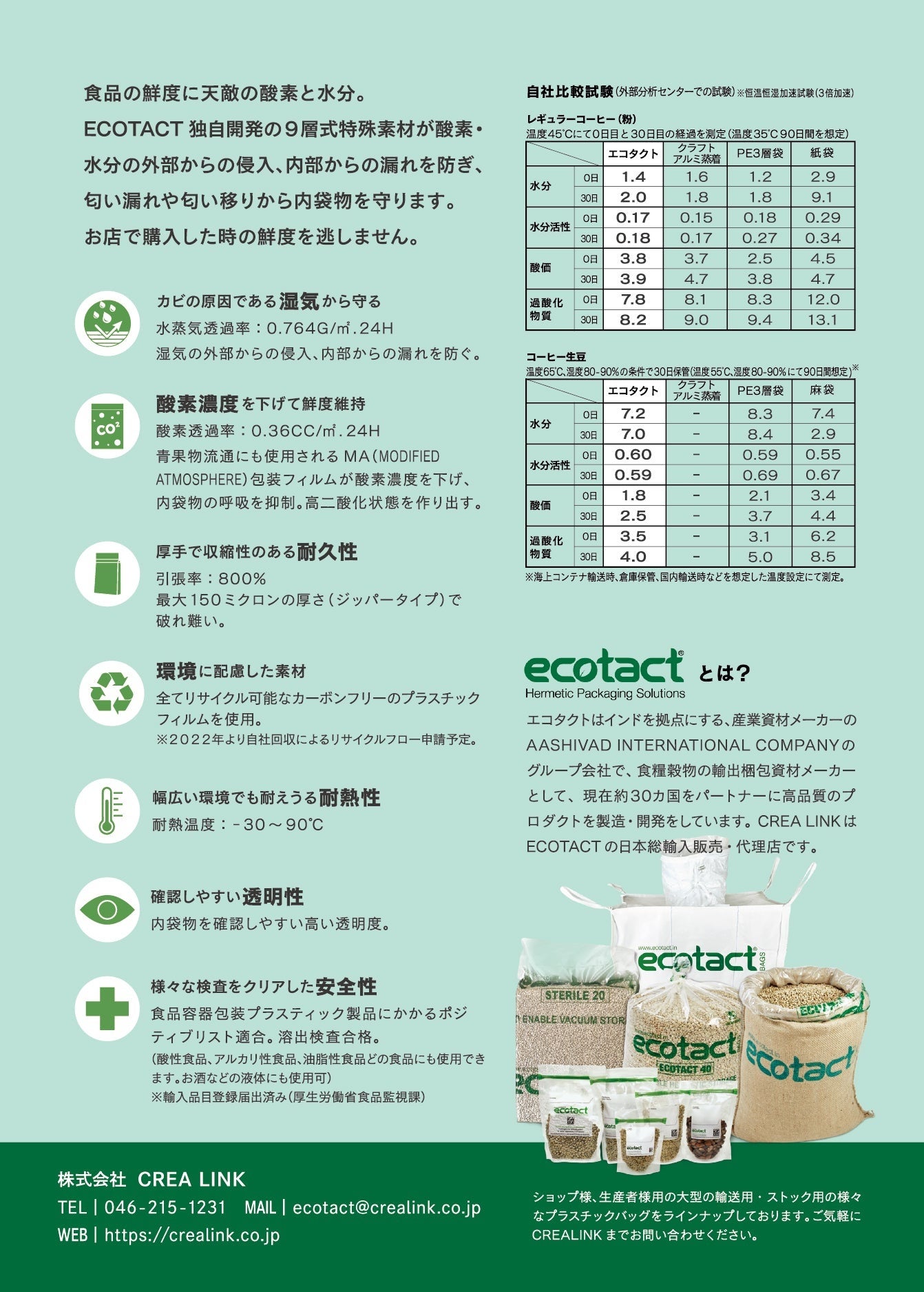 エコタクトはインドを拠点にする、産業資材メーカーのAASHIRVAD INTERNATIONAL社のパッケージブランドで、食糧穀物の輸出梱包資材メーカーとして、現在約30ヵ国をパートナーに高品質のプロダクトを製造・開発しています。CREA LINKはエコタクト(ECOTACT)の日本総輸入販売代理店です。