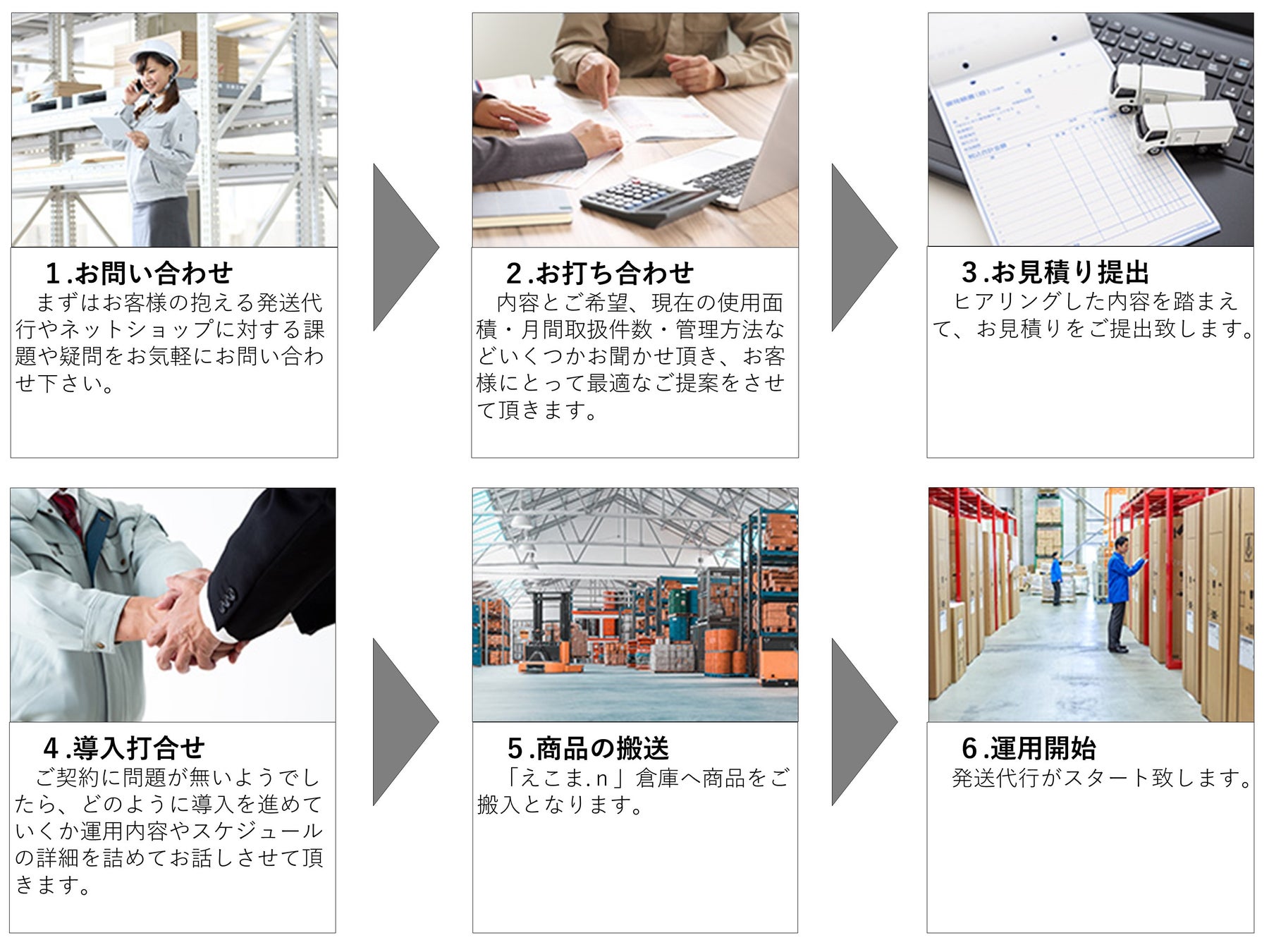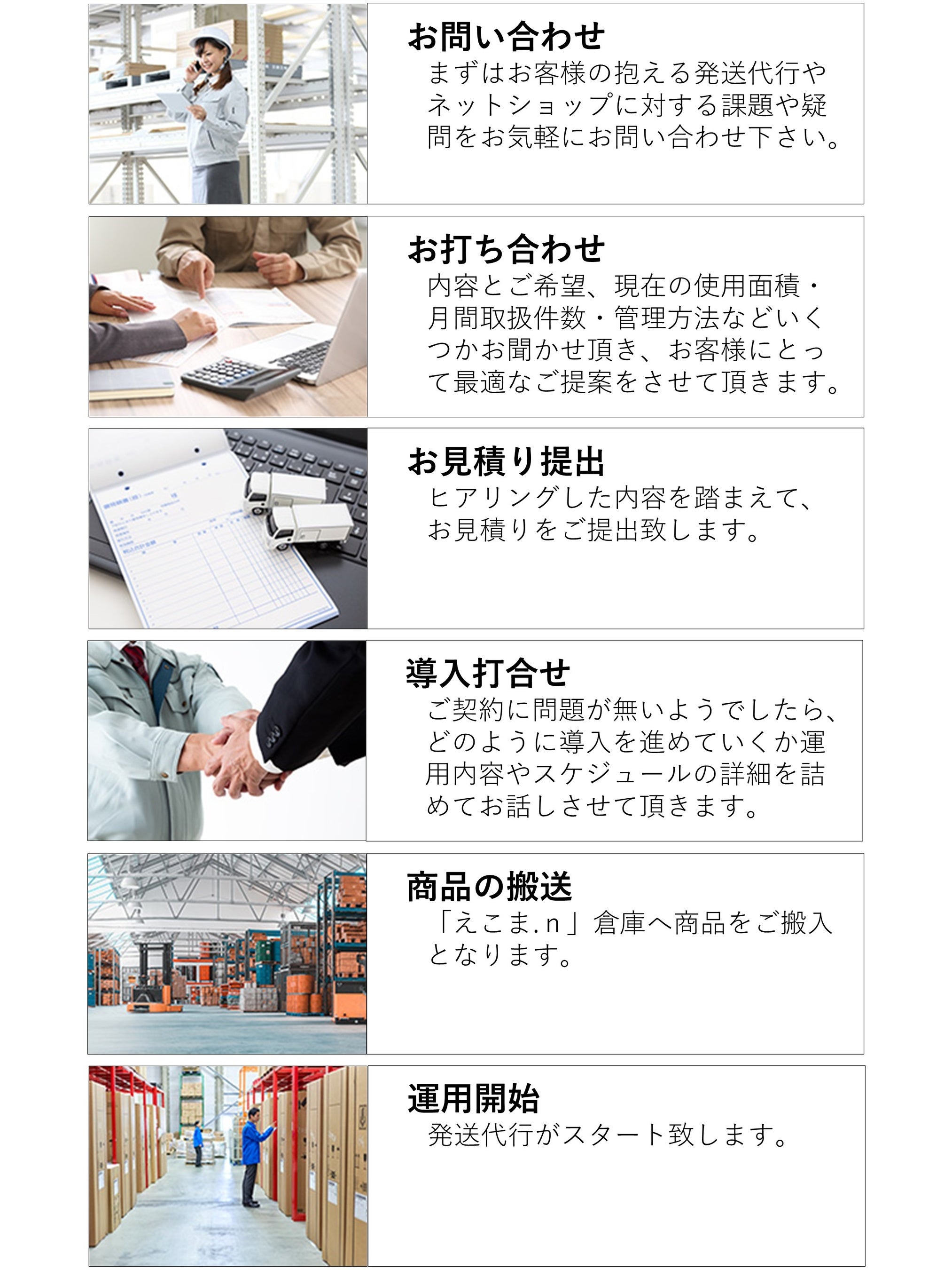 導入中倉庫の切換え、新規事業立ち上げ前(検討中)、個人・法人問わず、お客様のご要望に合わせて最適な物流提案を行います。お問い合わせは専用サイト(https://ecoma-n.com/)内にある、お問い合わせフォームからお気軽にご連絡下さい。お打ち合わせに関しては、Zoom等でオンライン対応も可能。倉庫内見学もコロナ禍等で来社が困難な場合には写真や動画など導入前のタイミングで確認も頂けますのでご安心ください。運用開始まで最短で約2週間(14日間)でサービススタートも可能(お客様のご要望により期間は前後します)。