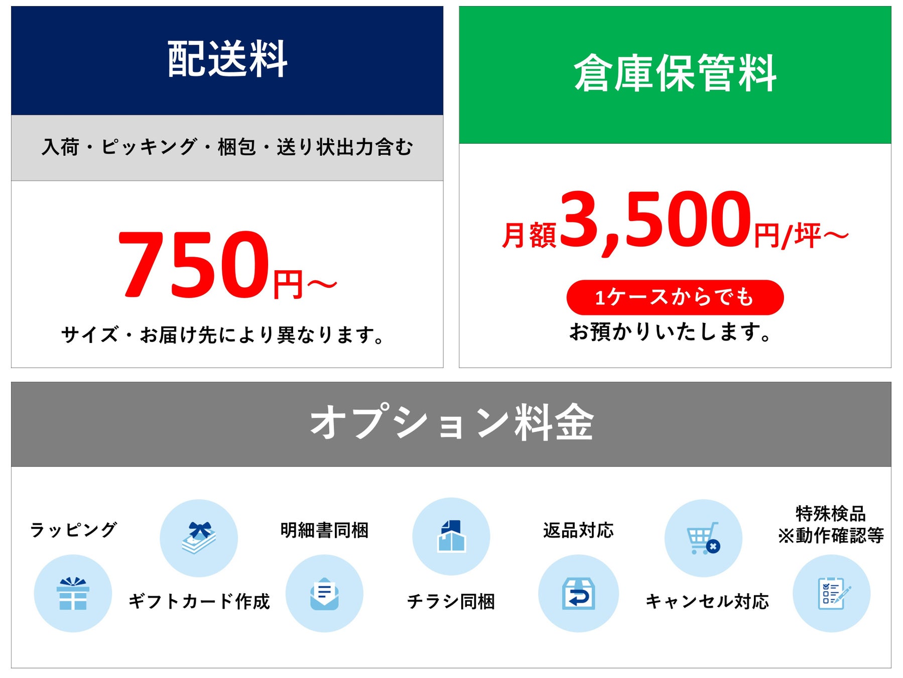 ⇒月間出荷件数、取扱商品の種類など特別な指定や条件はありません。管理方法等もご相談に沿った条件でご対応可能。
