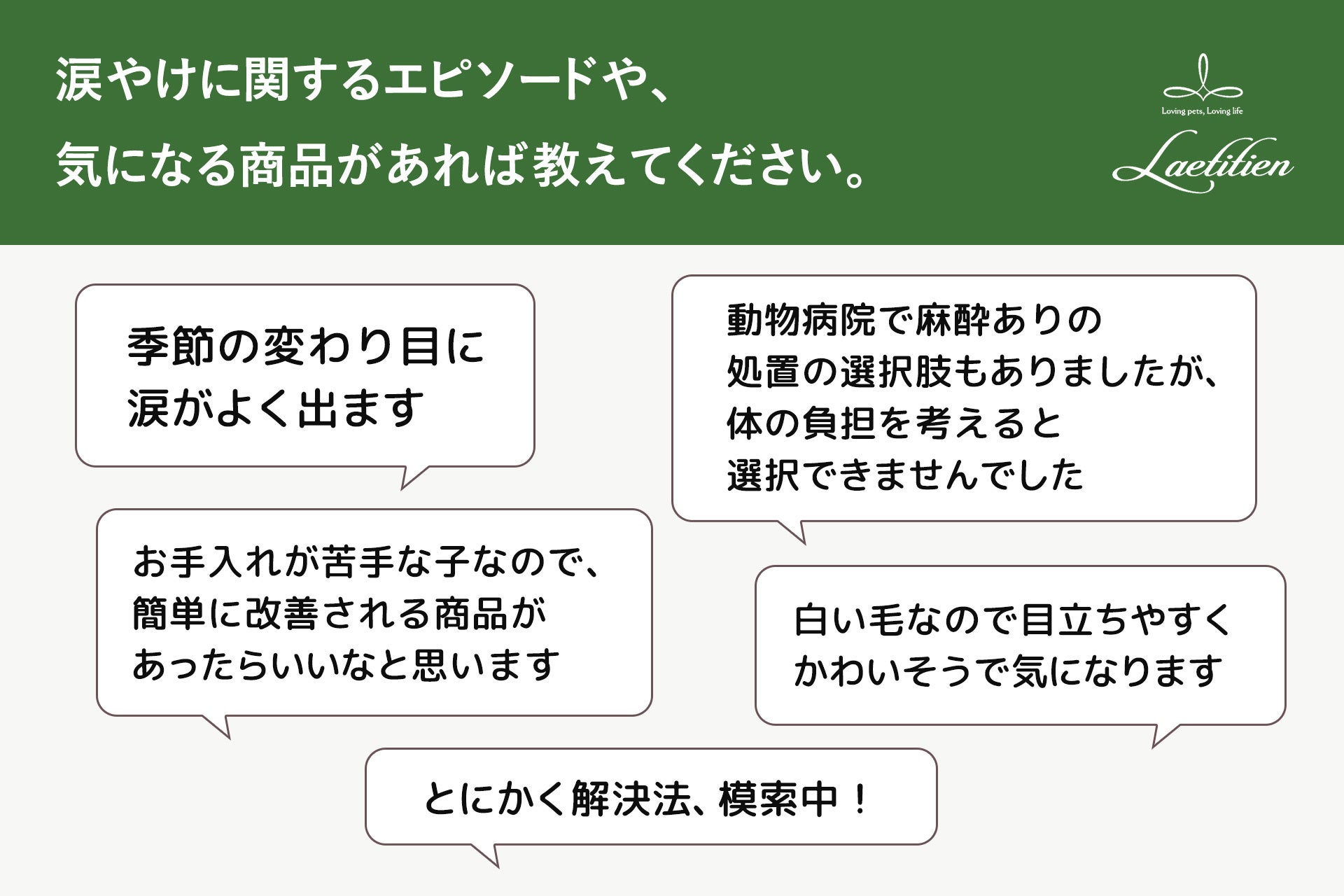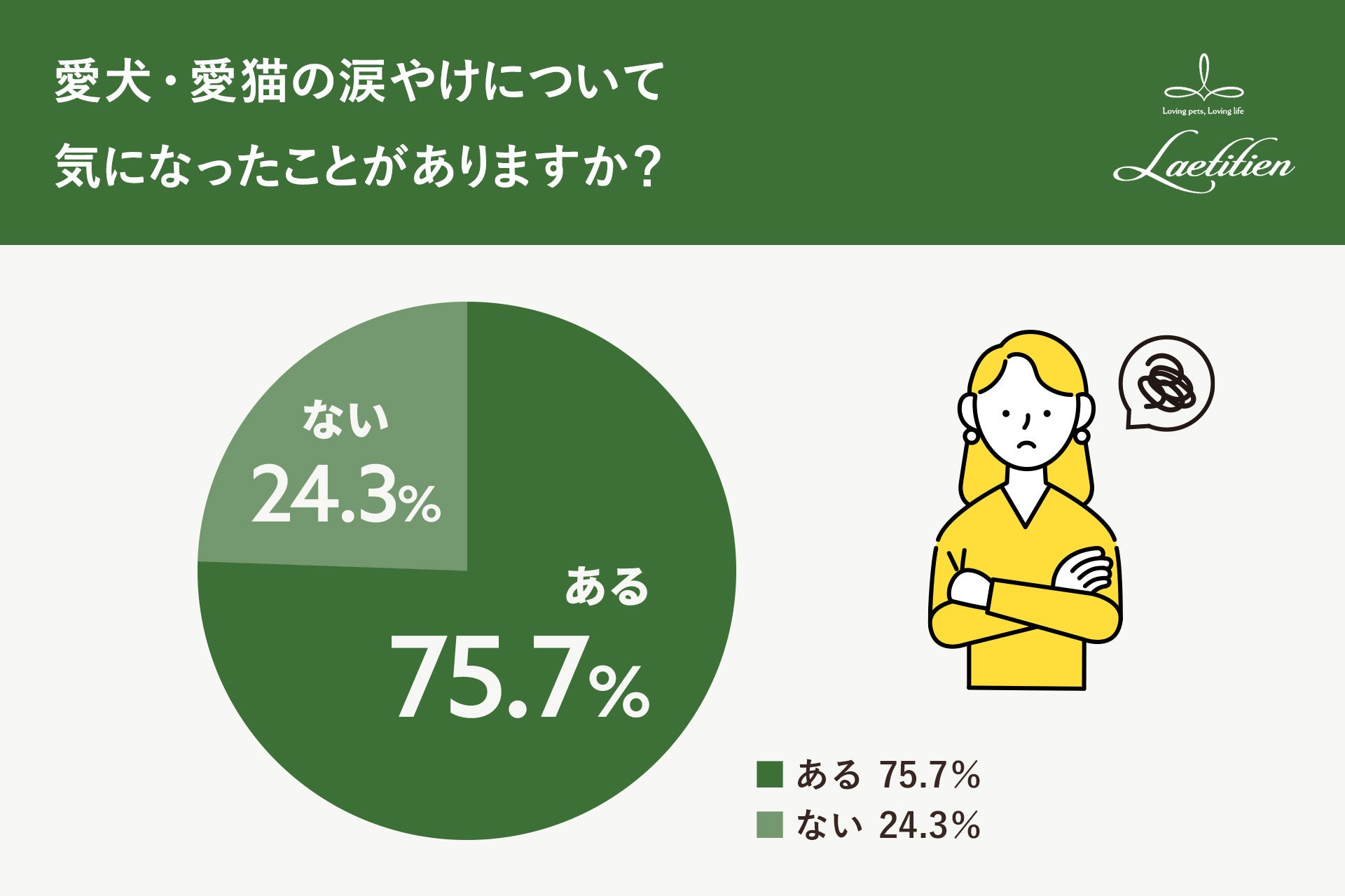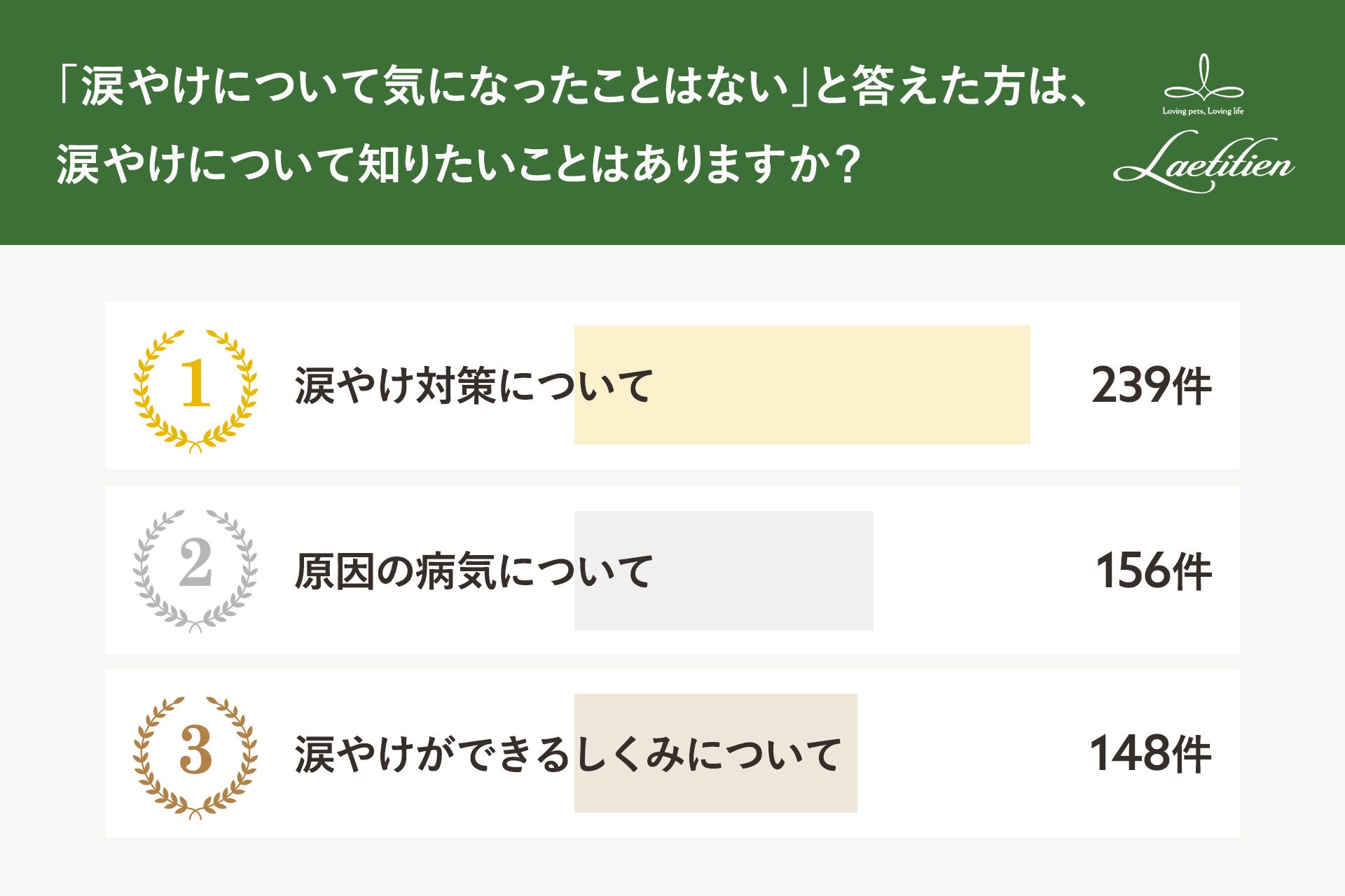 とても多くのペットオーナー様が、愛犬・愛猫の涙やけについて気になっている・悩んでいることが分かりました。レティシアンの公式サイトでは獣医師による【涙やけ】についての解説コラム(https://laetitien.co.jp/column/)を公開しておりますので、ぜひ合わせてご参照ください。
