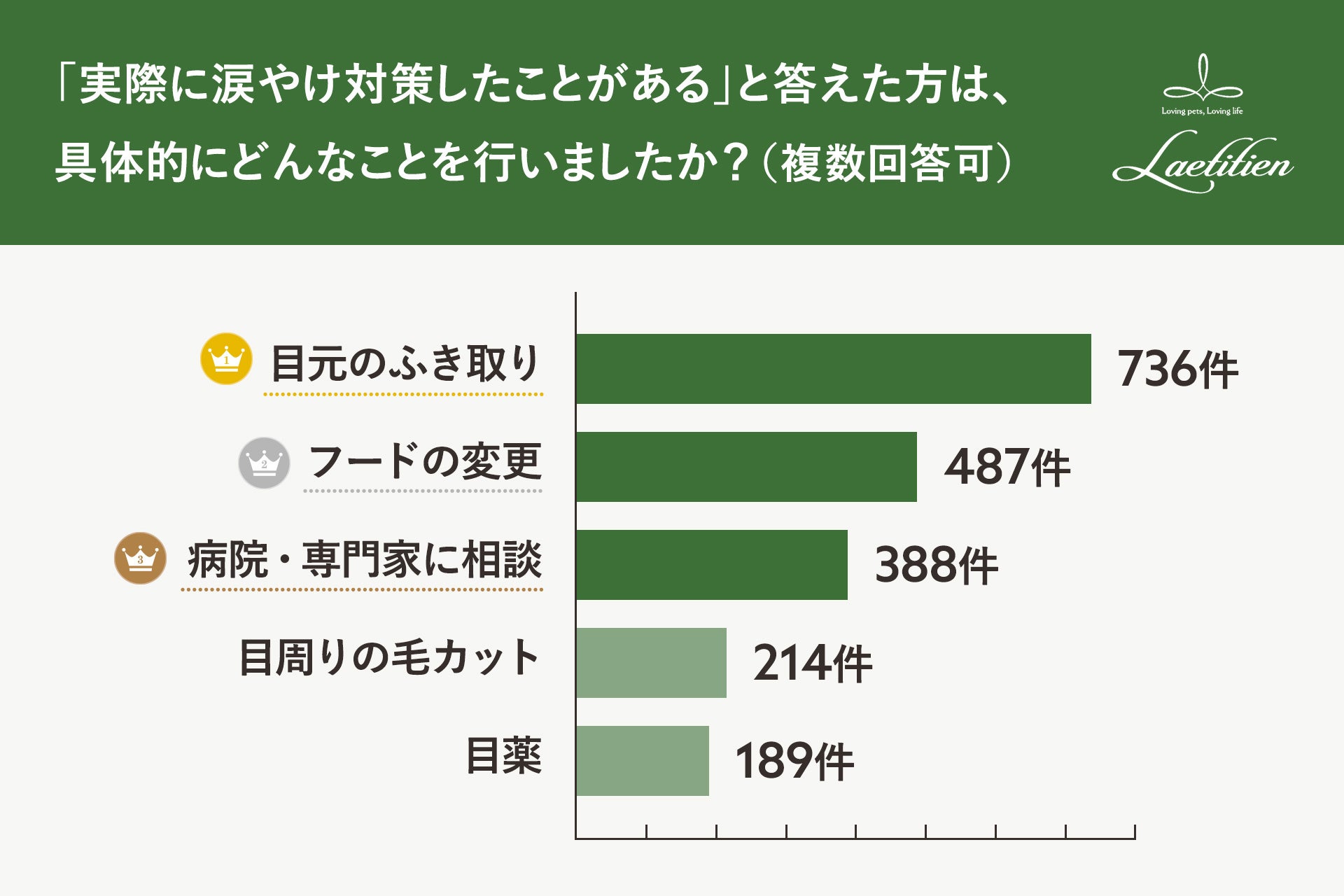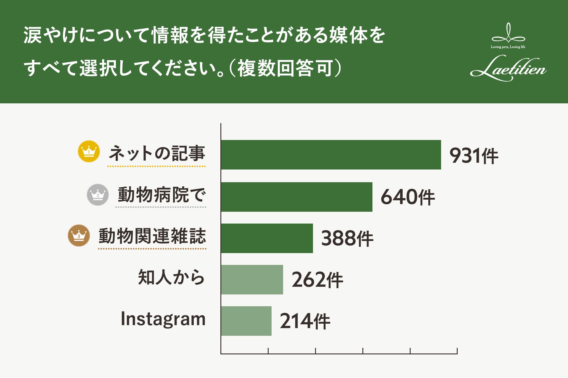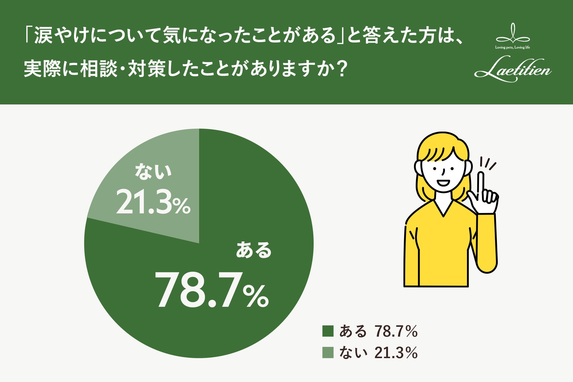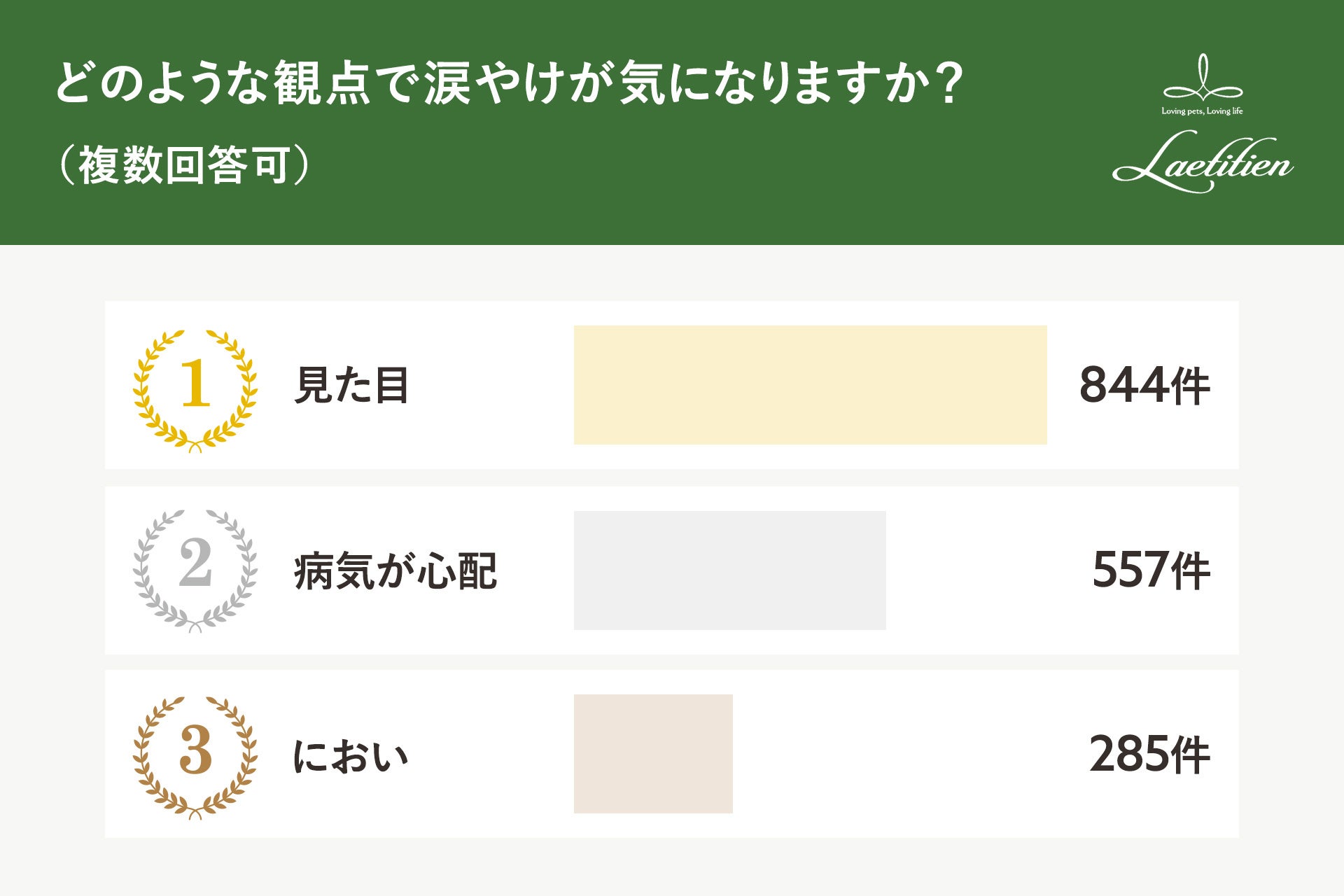 とても多くのペットオーナー様が、愛犬・愛猫の涙やけについて気になっている・悩んでいることが分かりました。レティシアンの公式サイトでは獣医師による【涙やけ】についての解説コラム(https://laetitien.co.jp/column/)を公開しておりますので、ぜひ合わせてご参照ください。