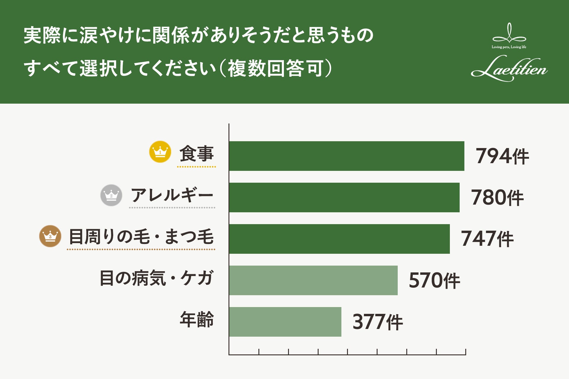 トップ3は半分以上の方が涙やけに関係がありそうと感じていました。複数回答が多く、様々な要因が涙やけに関係していると感じているオーナー様が多いようです。