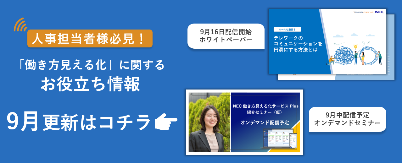 「働き方の見える化」お役立ち資料を無料配信中です。9月は下記情報を配信予定です。一度、資料ダウンロード等で情報を登録いただきますと、メールにて「最新おすすめ情報」をお届けさせていただきます。是非、公開中の資料もご確認ください。