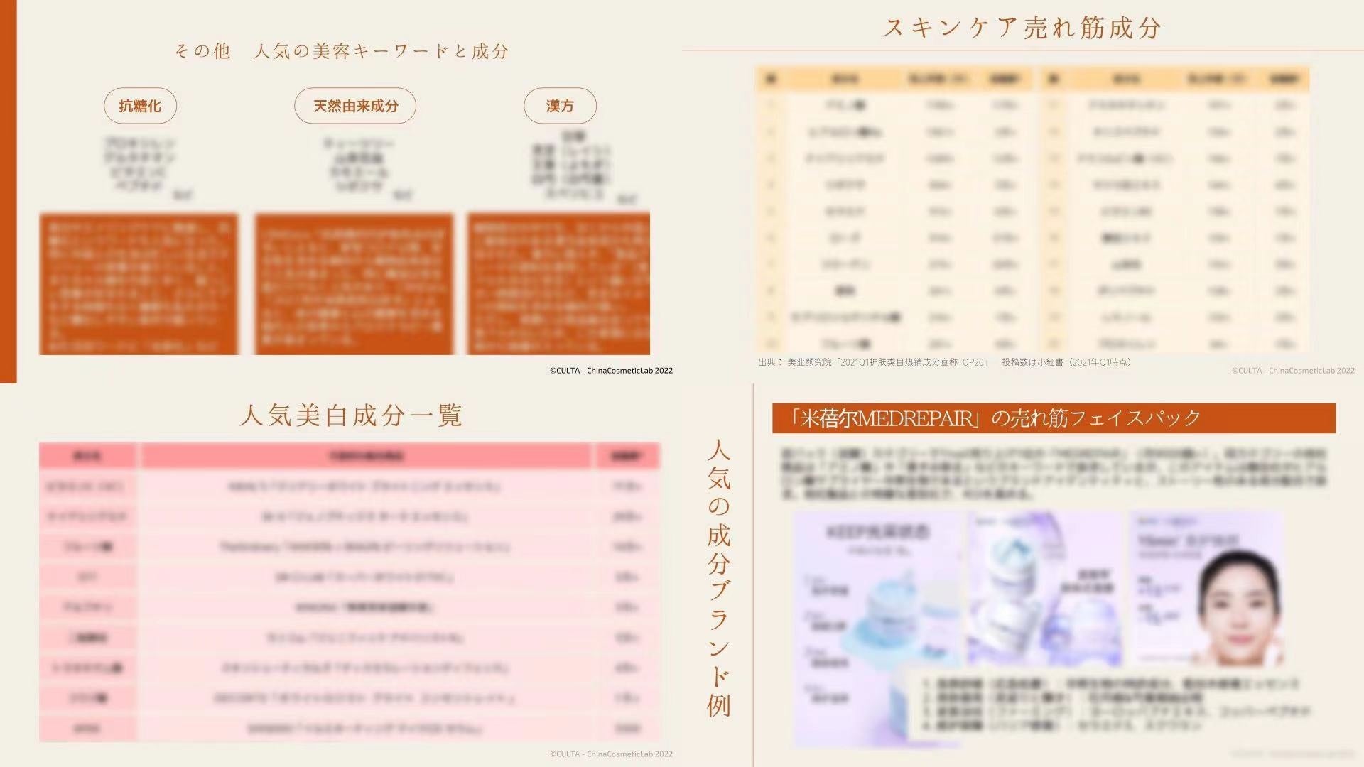 こうした背景を踏まえ、本レポートでは中国市場で広く知られる成分から、最新のトレンド成分、成分情報の拡散方法、配合成分を基点としたマーケティング事例などをまとめました。