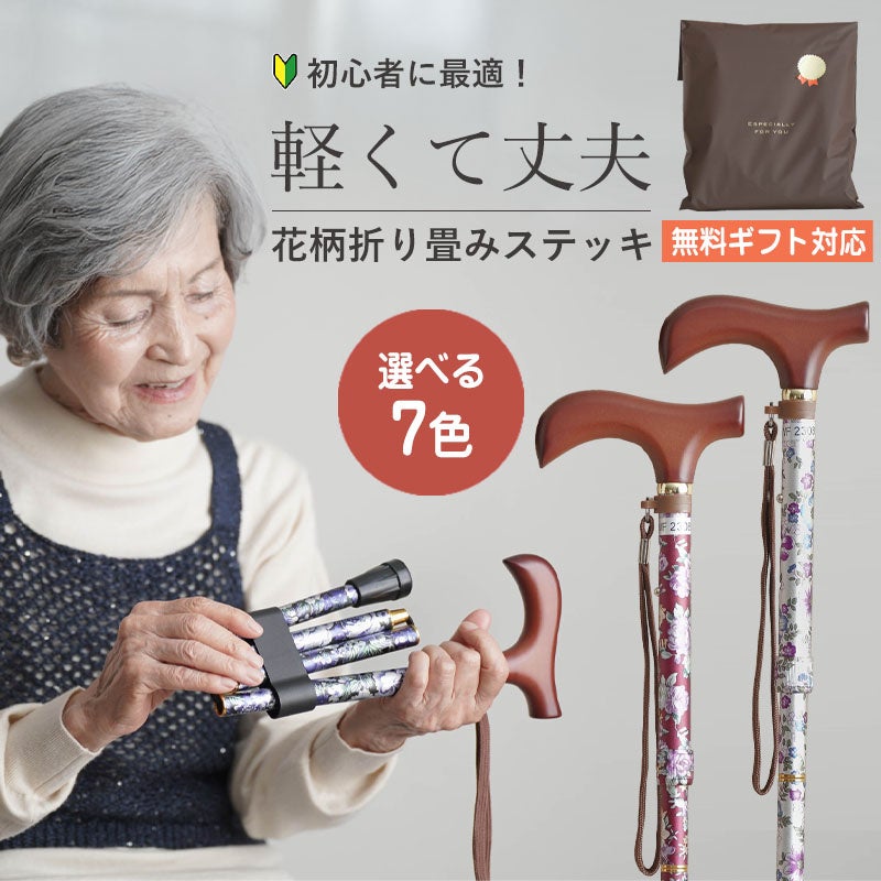 軽量アルミ製で持ち運びしやすく、折りたたみ可能なステッキです。おしゃれな花柄で、ファッションアイテムとして贈れるギフトです。身長に合わせて長さ調節も可能なので、使う人に合わせて使用できます。