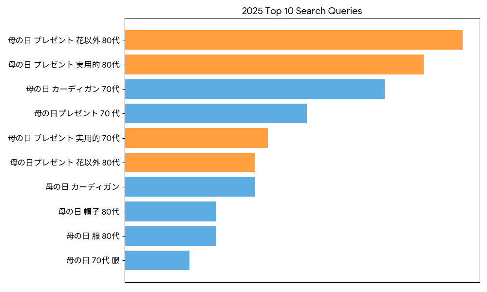 「母の日 プレゼント 花以外 80代」という検索が非常に高いボリュームを占めており、消え物ではない、長く愛用できる品を求める声が顕著です。