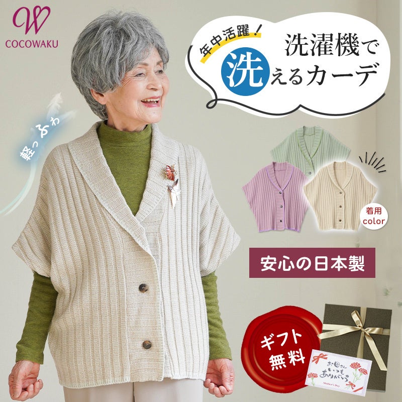 施設内や室内での冷え対策に最適な、軽くて暖かい日本製ニット。洗濯機で丸洗いできるため、お手入れも簡単で贈り物に最適です。