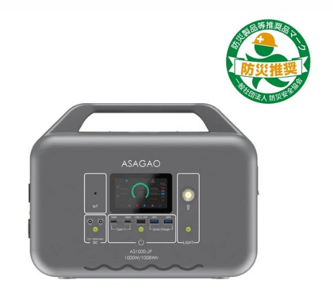 ASAGAO JAPAN 合同会社(本社:東京都港区、以下ASAGAO JAPAN)は、安全性の高いリン酸鉄リチウムイオンを採用したポータブル電源「AS1000-JP」および「AS12-JP」は、一般社団法人防災安全協会の定める「防災製品等推奨品」の認証を取得しました。