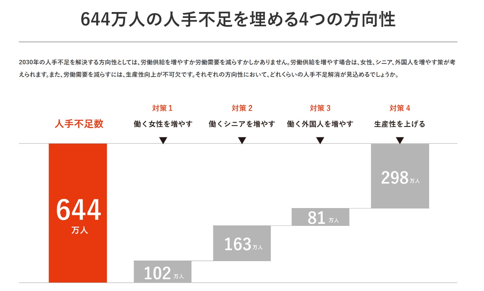 2030年に644万人が不足すると言われている日本の労働人口(出典:パーソル総合研究所)において、女性、シニア世代の働く人口を増やすことは、社会課題の解決につながります。