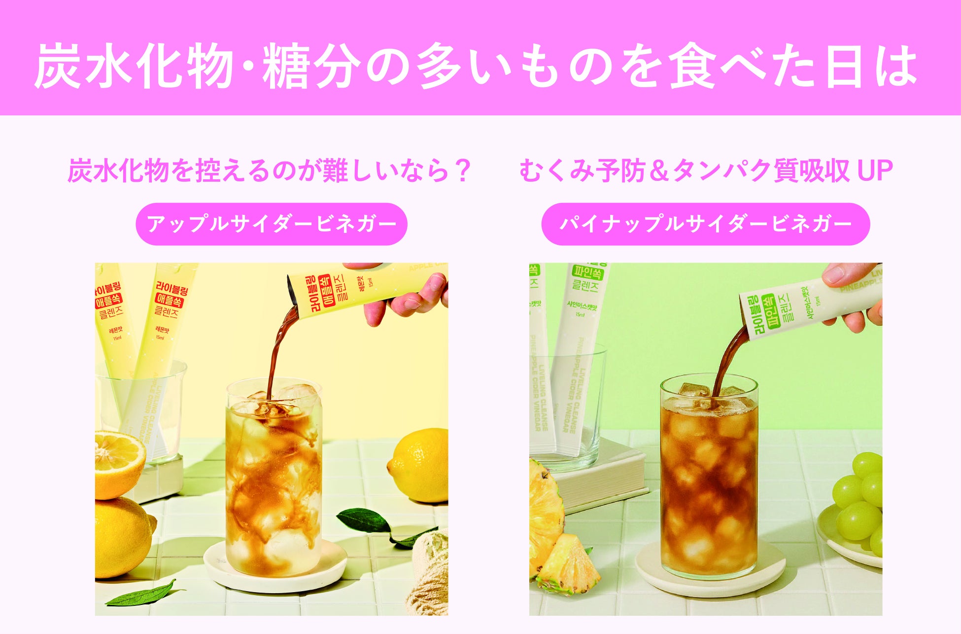 レモン味とグレープフルーツ味にはアップルサイダービネガーが、シャインマスカット味と梅味にはパイナップルサイダービネガーが使用されています。「食べすぎたな」と感じた時にはアップルサイダービネガー、日常的なむくみケアにはパイナップルサイダービネガーを取り入れていただくことをおすすめいたします。