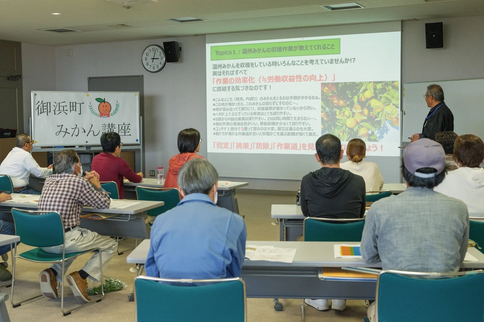 新規就農者の知識・技術不足の懸念解消のため、実地研修とは別で、座学の「みかん講座」を年20回ほど開催しており、研修生からは大変好評です。講座は移住者同士横の繋がりを作ることにも一役担っています。不要になった農機具・軽トラなどを引き継げる制度「農機具バンク」も開始しました。このように、出てきた課題に一つずつ向き合っています。今後 新規就農者のための農地確保・継承を促進するために、農地バンク制度の整備などを行っていますが、ニーズに十分応えきれているとはいえない状況です。地元の方への理解促進と、産地の一体感醸成を、次のミッションと捉え、今回のシンポジウムを企画しています。」