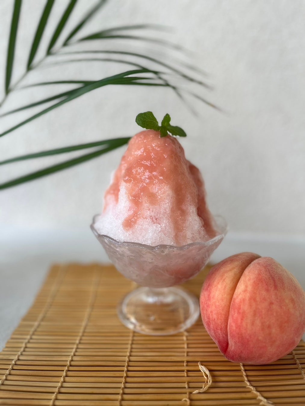 長崎県、雲仙普賢岳の火山灰のミネラルを多く含んだ土壌を活かし、有機無農薬で育てられた桃を使用しております。この有機桃をたっぷり使った特製シロップで、まるで桃を丸ごと食べてるかの様な、なんとも贅沢な味わいを体験していただきたいです!見た目はもちろん、ココロにもカラダにも優しい贅沢かき氷となっております。テイクアウトも承っておりますのでお気軽に足をお運びくださいませ♪