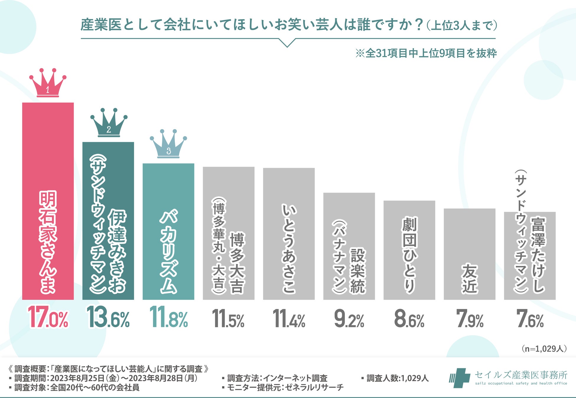 「産業医として会社にいてほしいお笑い芸人は誰ですか?(上位3人まで)」と質問したところ、『明石家さんま(17.0%)』と回答した方が最も多く、次いで『伊達みきお(サンドウィッチマン)(13.6%)』『バカリズム(11.8%)』『博多大吉(博多華丸・大吉)(11.5%)』『いとうあさこ(11.4%)』と続きました。