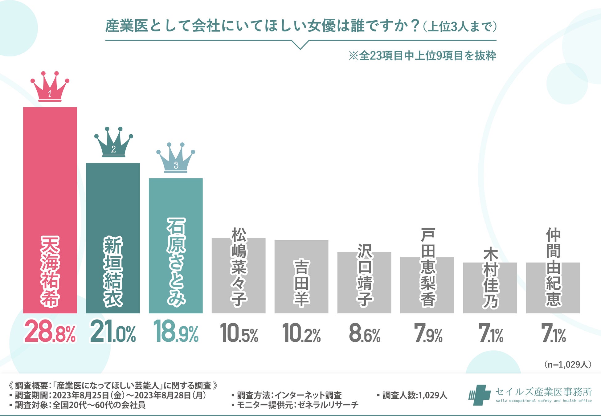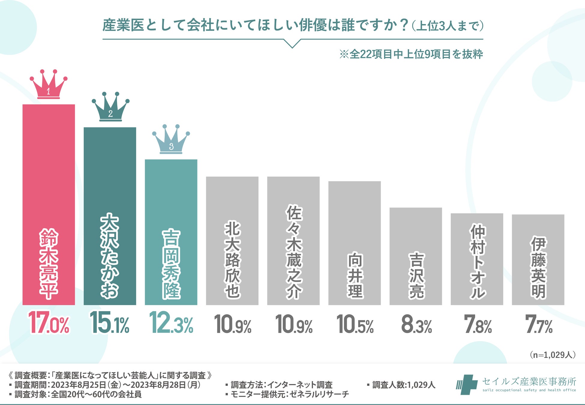 そこで今回、産業医事務所をはじめ中小企業向けの総合的な健康管理サービスを提供する『セイルズ産業医事務所』(https://www.sailz.co.jp/)を運営する株式会社セイルズは、全国20代〜60代の会社員を対象に、「産業医になってほしい芸能人」に関する調査を実施しました。