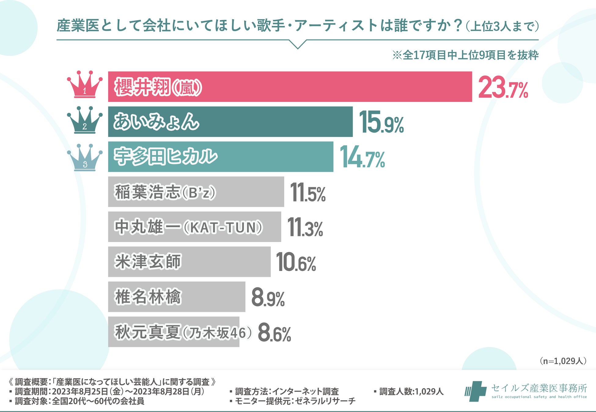 「産業医として会社にいてほしい歌手・アーティストは誰ですか?(上位3人まで)」と質問したところ、『櫻井翔(嵐)(23.7%)』と回答した方が最も多く、次いで『あいみょん(15.9%)』『宇多田ヒカル(14.7%)』『稲葉浩志(B’z)(11.5%)』『中丸雄一(KAT-TUN)(11.3%)』と続きました。