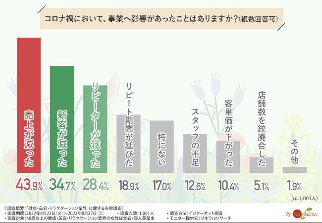 そこで、「コロナ禍において、事業へ影響があったことはありますか?(複数回答可)」と質問したところ、『売上が減った(43.9%)』と回答した方が最も多く、次いで『新客が減った(34.7%)』『リピーターが減った(28.4%)』と続きました。