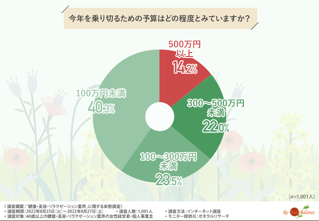 続いて、「今年を乗り切るための予算はどの程度とみていますか?」と質問したところ、『500万円以上(14.2%)』『300~500万円未満(22.0%)』『100~300万円未満(23.5%)』『100万円未満(40.3%)』という回答結果になりました。