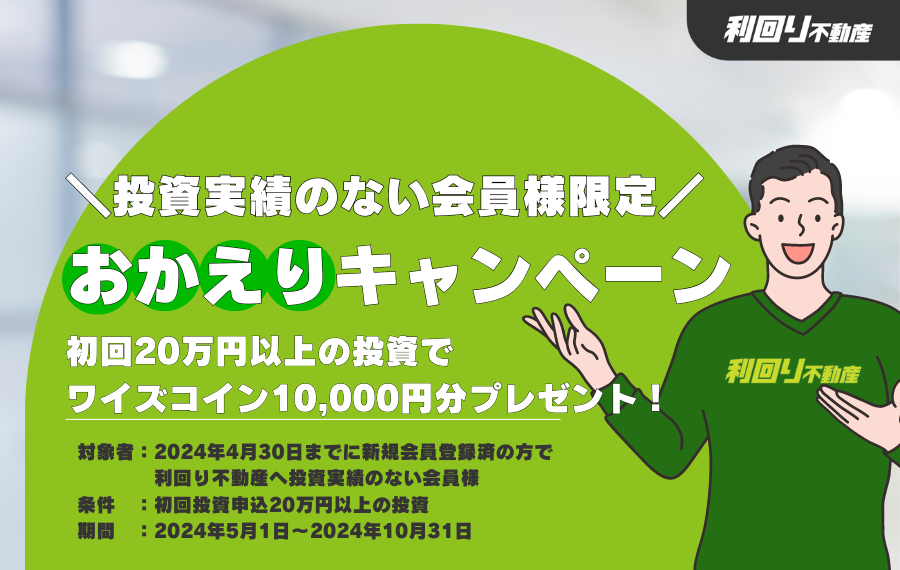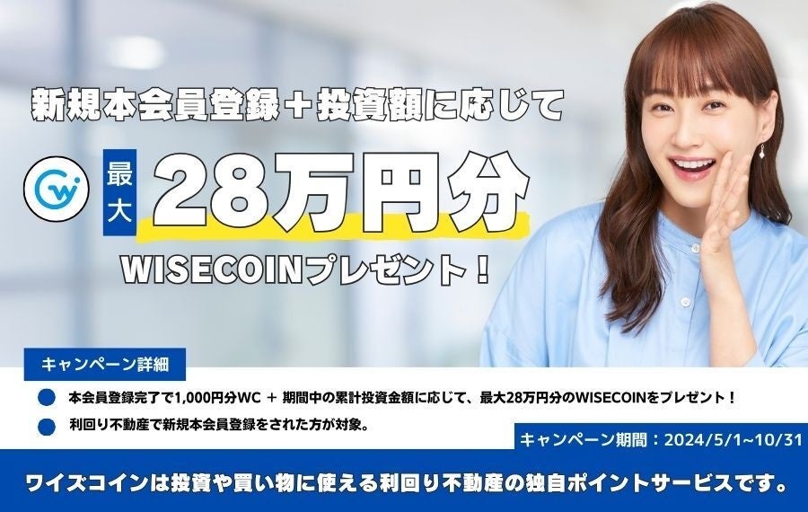 対象の3ファンドへの累計投資金額に応じて、最大1.5%分を、「利回り不動産」の独自のポイント「ワイズコイン」としてプレゼントいたします。複数ファンドに分散投資された場合でも、3ファンドの募集期間内に対象ファンドへ投資された合計額を基に計算いたします。