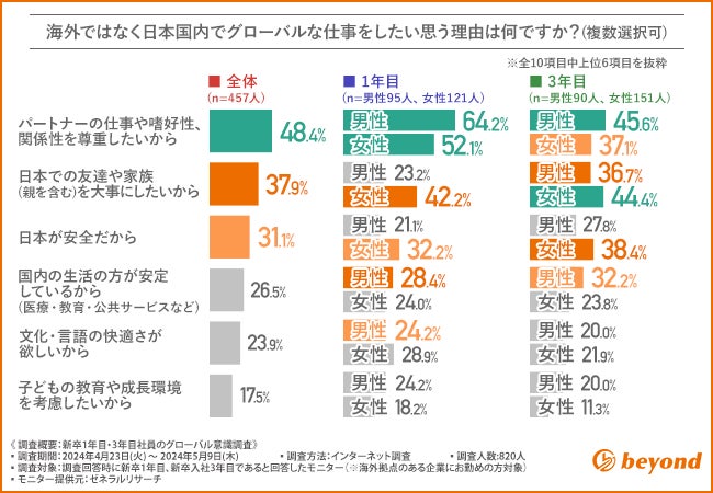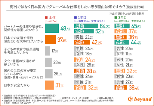 冒頭の質問で、「日本国内で外国の企業や外国の方と関わる仕事に興味がある」と回答した方に、「海外ではなく日本国内でグローバルな仕事をしたい思う理由は何ですか?(複数選択可)」と質問したところ、『パートナーの仕事や嗜好性、関係性を尊重したいから(48.4%)』と回答した方が最も多く、次いで『日本での友達や家族(親を含む)を大事にしたいから(37.9%)』『日本が安全だから(31.1%)』と続きました。