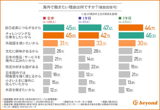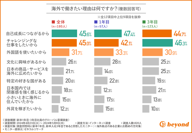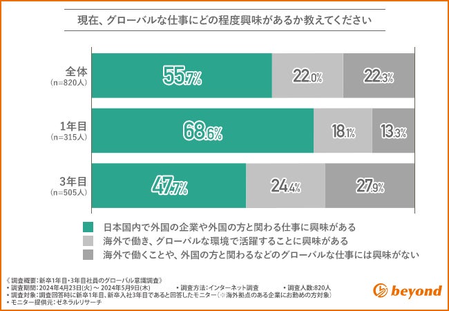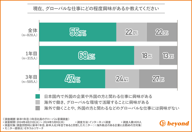 そこで今回、グローバル人材育成を行っているbeyond global Japan株式会社(https://www.beyond-g.com/)が、海外拠点のある日系企業に勤める新入社員と3年目の社員、合計820人を対象に、海外赴任に加えて、国内でのグローバルな仕事に対する意識も含めて「新卒1年目・3年目社員のグローバル意識調査」を実施しました。