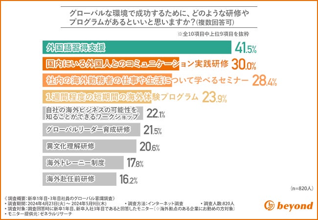 そこで、「グローバルな環境で成功するために、どのような研修やプログラムがあるといいと思いますか?(複数回答可)」と質問したところ、『外国語習得支援(41.5%)』と回答した方が最も多く、次いで『国内にいる外国人とコミュニケーションをとることができるコミュニケーション実践研修(30.0%)』『社内での海外勤務者の仕事内容・生活面などを知ることができるグローバルキャリアセミナー(28.4%)』『1週間程度の短期間の海外体験プログラム(23.9%)』と続きました。