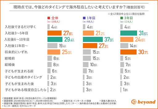 また、女性の方が男性よりも入社後の早い段階で海外駐在をしたいと考えており、同様にライフイベントを想定していることがうかがえます。