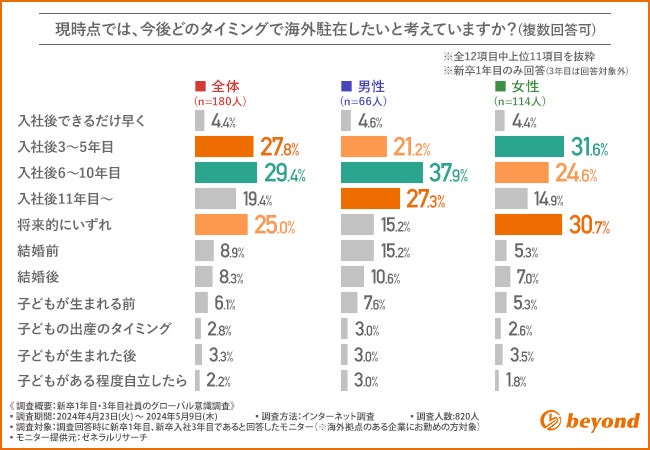 海外で働くタイミングは、女性の方が"早いタイミング"を希望。女性は3〜5年目、男性は6〜10年目。