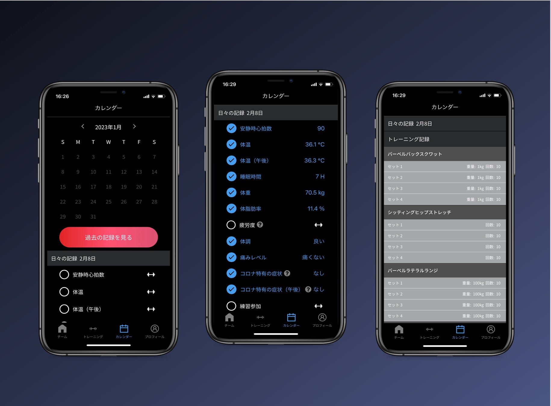 プロトレーナー監修の300を超えるトレーニング動画とそれらを組み合わせて作成されるトレーニングプラン・選手個々人の体調管理機能が備わっており、選手がアプリで入力した内容は全てデータ化され、トレーナー・コーチの管理画面にて確認・出力することが可能です。